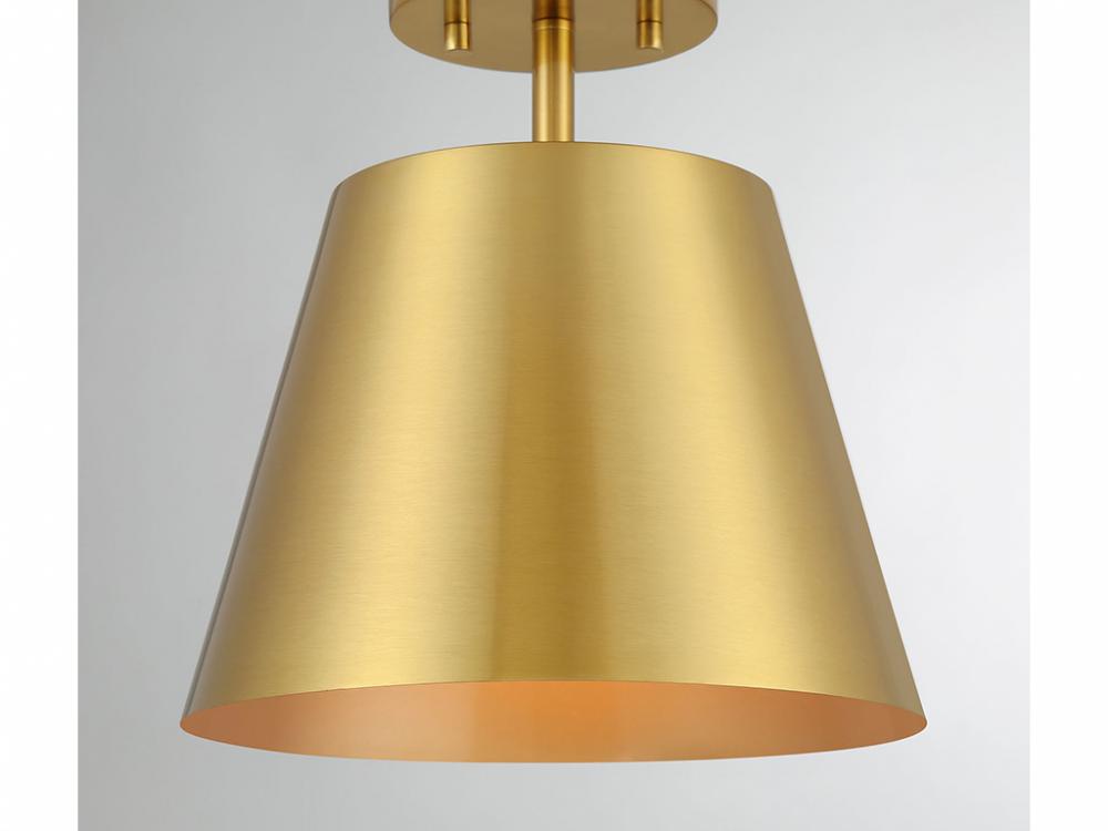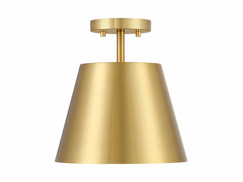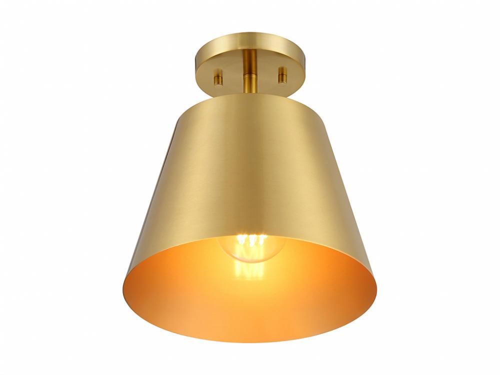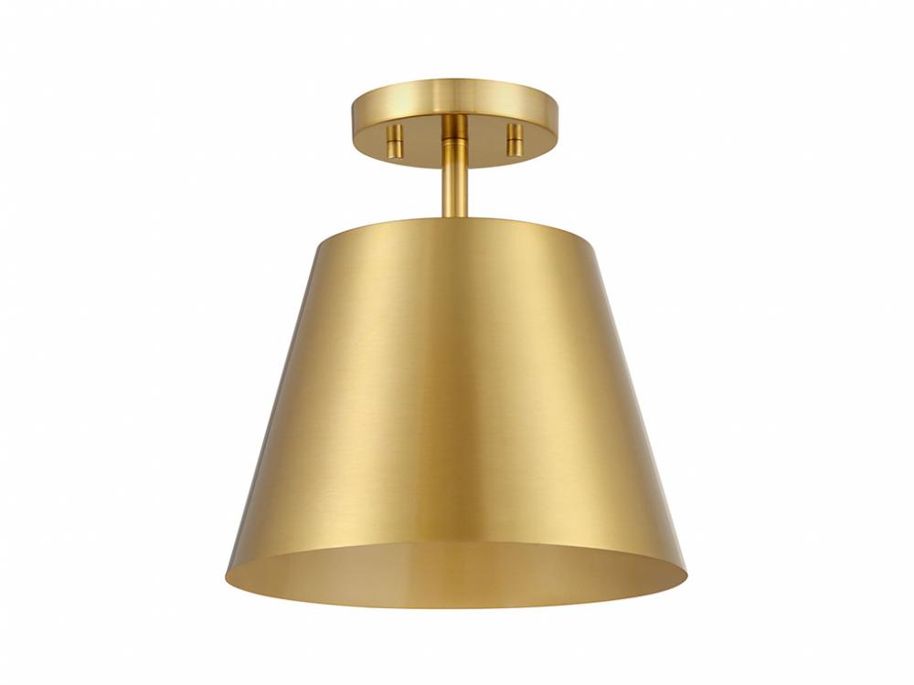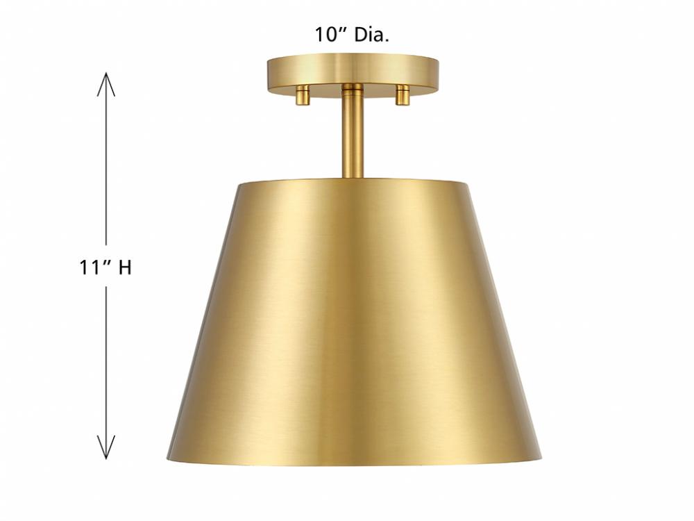 This sleek, chic 1-light ceiling semi-flush mount has a bold solid metal shade to concentrate and direct the light for a bright and dramatic glow. Its Natural Brass finish heightens the appeal. 11" height, 10" width, uses 1 standard size bulb of up to 60 watts. Bulb not included.