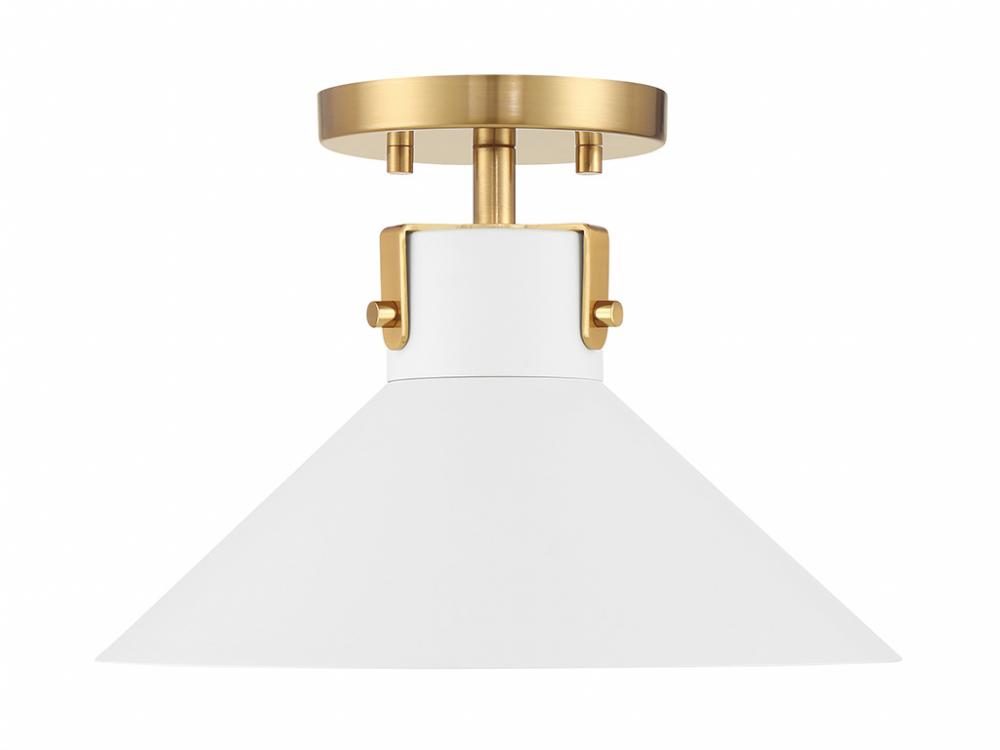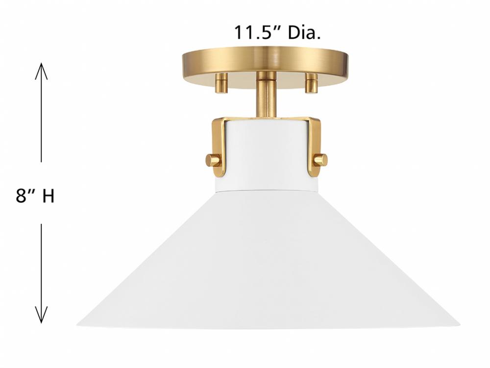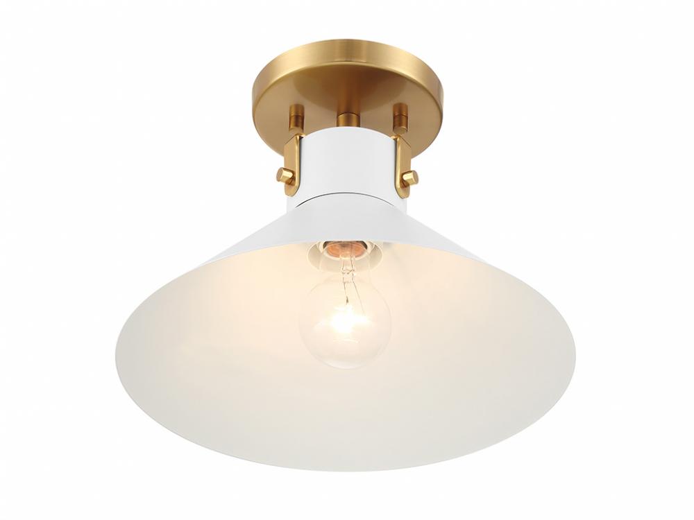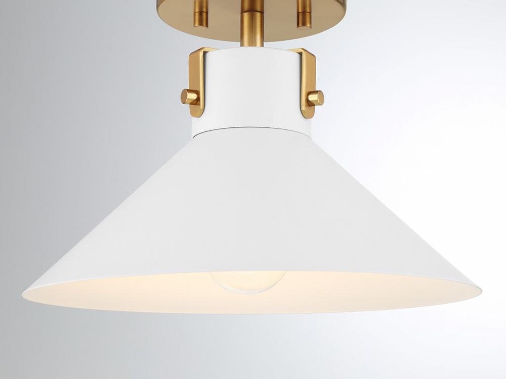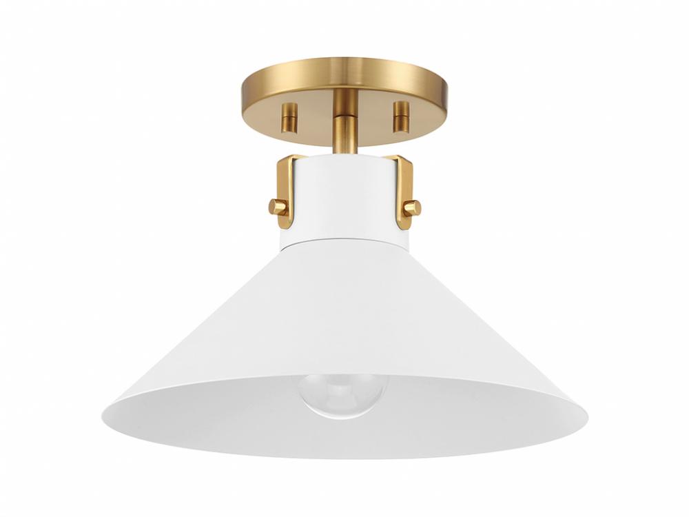 This 1-light ceiling semi-flush mount offers up big style in a small package. Brightening up any room, even cozier spaces like closets and laundry rooms, is a snap with this crisp combination of a metal shade finished in White and hardware finished in Natural Brass. The opaque shade will concentrate and direct the light. This fixture is 8" in height and 11.5" in width. It uses 1 standard size bulb of up to 60 watts. Bulb not included.