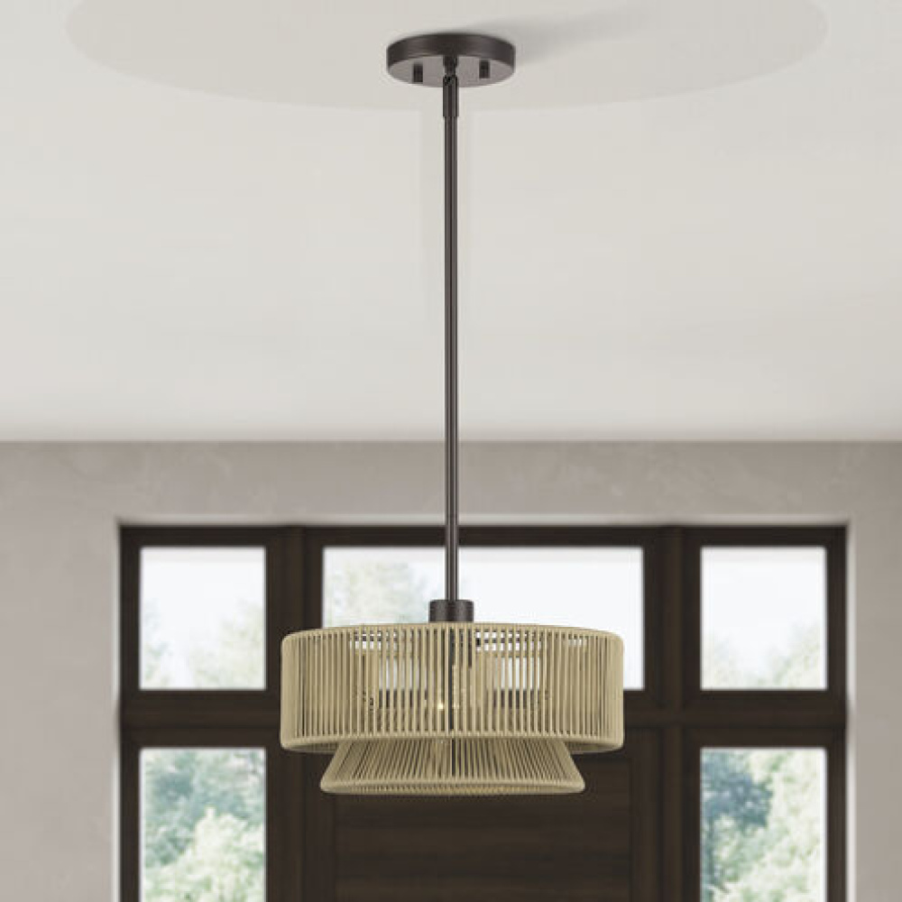 Laidback yet disciplined, the midcentury modern Florell lighting collection celebrates all versions of You: from “beach-haired weekender” to “visionary CEO”. with a vast selection in dramatic colors, this boho-inspired design features minimalist metal frames supporting drum-shaped, tapered and tiered shades – beautifully hand-threaded with sleek (fade- and fray-resistant) polyester rope. Semi-transparent texture allows for creating nuanced shadowing effects.