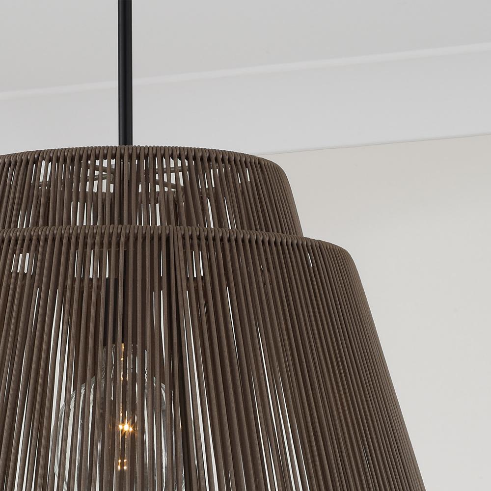 Purposefully crafted for interior and exterior spaces, the Jasper Indoor/Outdoor Pendant seamlessly blends durable design with high style. The weather-resistant hand-wrapped resin delivers a moody aesthetic in dark Umber brown, while the Matte Black finish gives a nod to modern style. Rated for Damp Locations and backed by our one-year warranty.