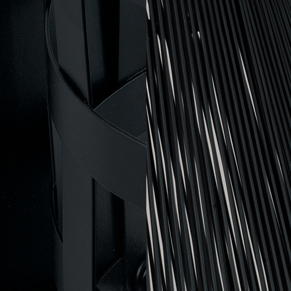 FINISH: A mixed material finish of durable hand-wrapped resin in a neutral black, plus neutral, dark, flat black metal.
