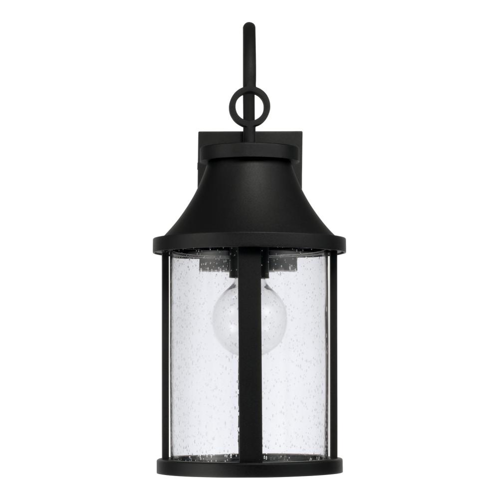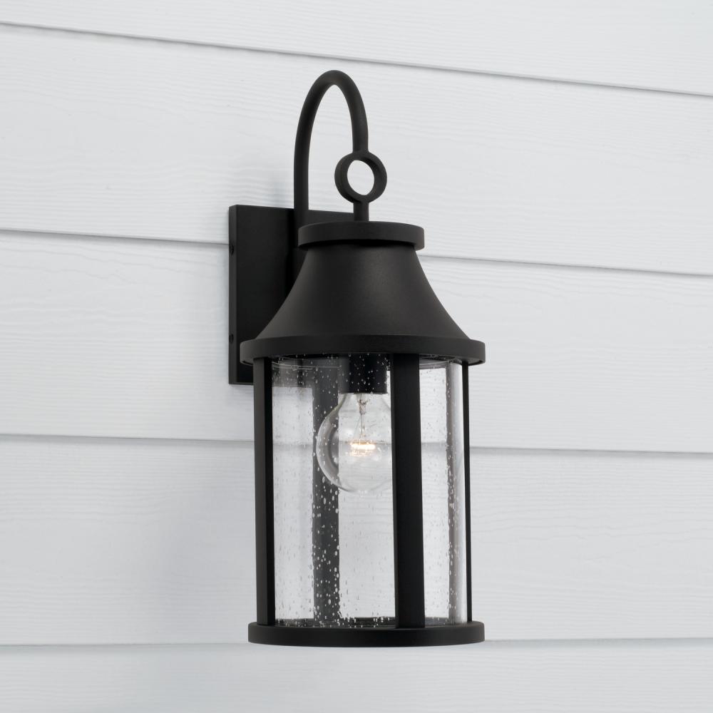 Circular forms and seeded glass create the Bridger Wall Lantern. The curved cap lines and ring detail on top bring all-around charming style, rounded out by our signature Black finish for a look that punctuates any outdoor space. Part of our Rain or Shine Series and backed by our five-year warranty.