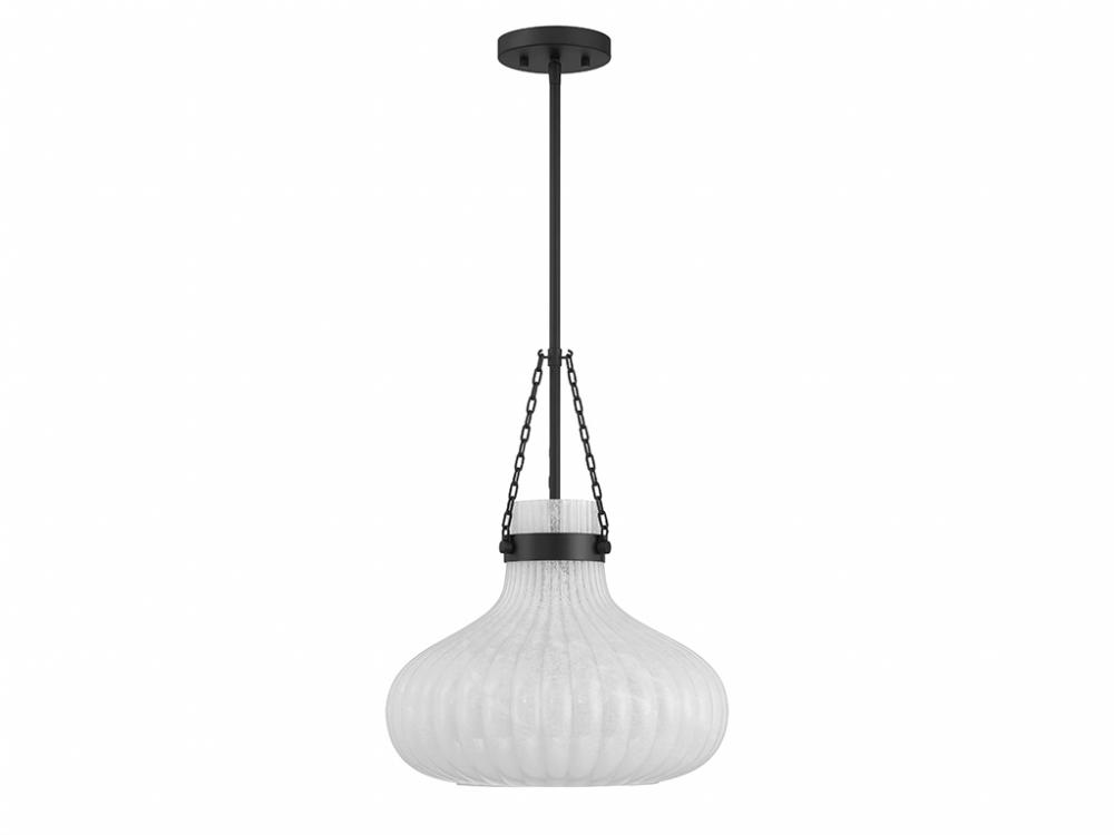 Traditional style lighting is given an ethereal upgrade in this beautiful 1-light pendant. Its fluted ribbed glass shade is made from strie glass featuring dazzling swirls that draw the eye, soften the glow and work beautifully with the Matte Black finish. This pendant is 15" in width and has an adjustable height ranging from 19" to 73". Comes with four 12" downrods and one 6" downrod. Uses one standard size bulb of up to 60 watts. Bulb not included.