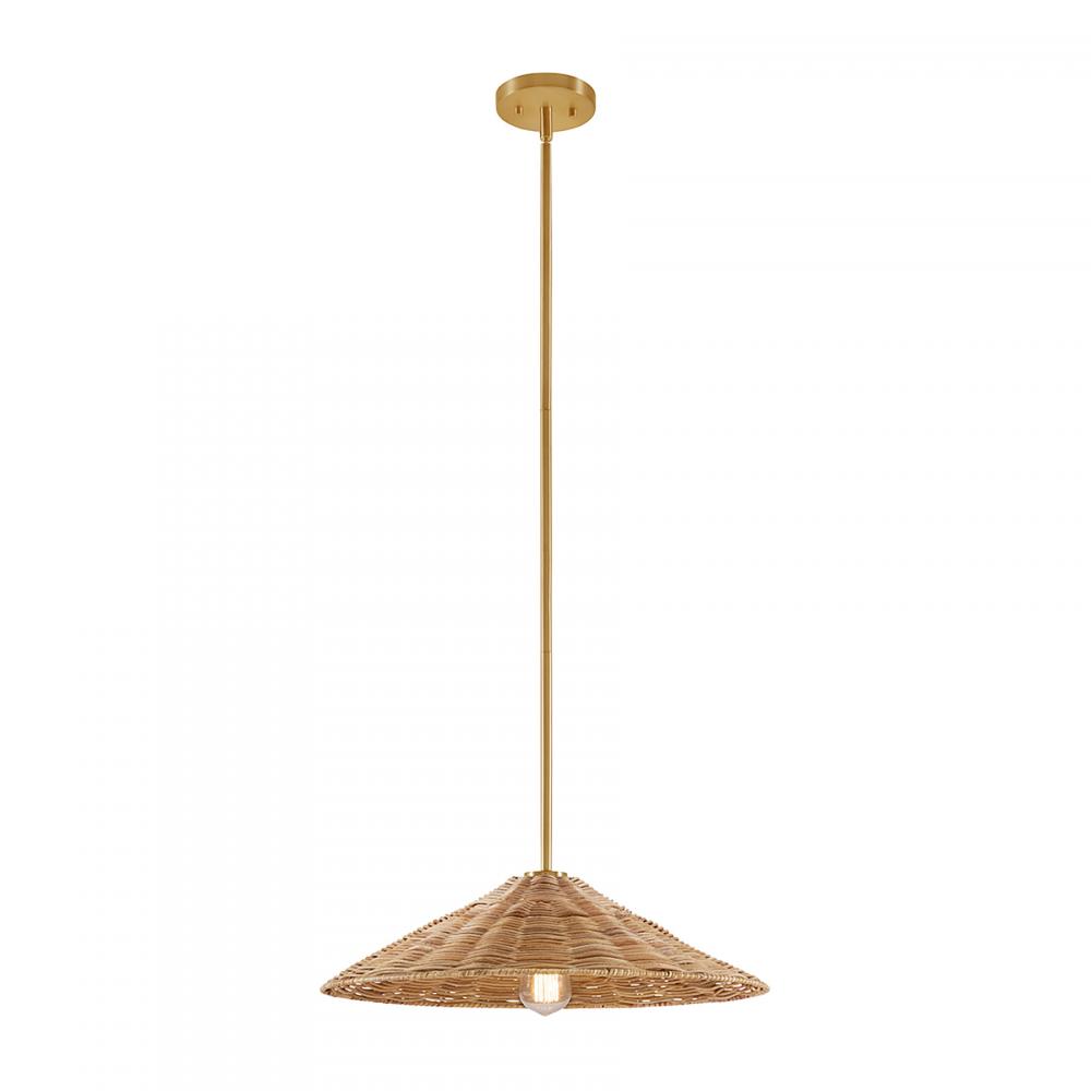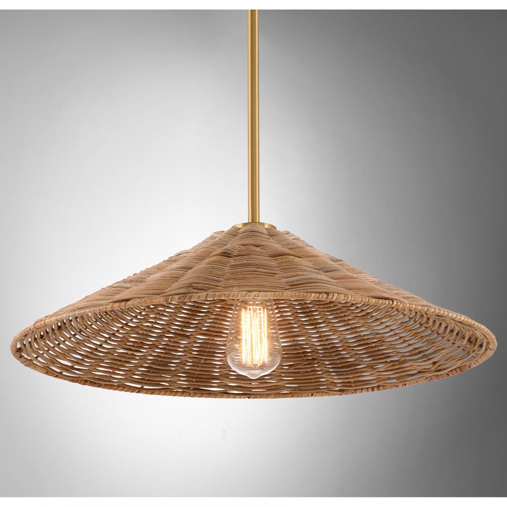 Add a relaxed, natural vibe to any room with this chic 1-light pendant. It flaunts a highly textured shade of natural rattan paired with a Natural Brass finish, bringing in a bold and fashionable flair. 5" height and 20" width. Uses one standard size bulb, max 60 watts. LED bulb compatible. Comes with four 12" downrods and one 6" downrod.
