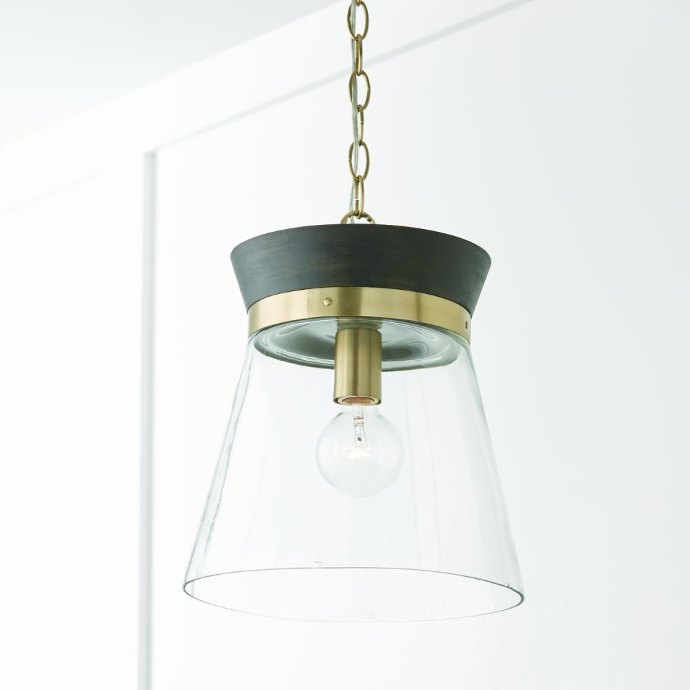 12"W x 14"H 1-Light Pendant in Black Stain Wood and Matte Brass with Clear Glass