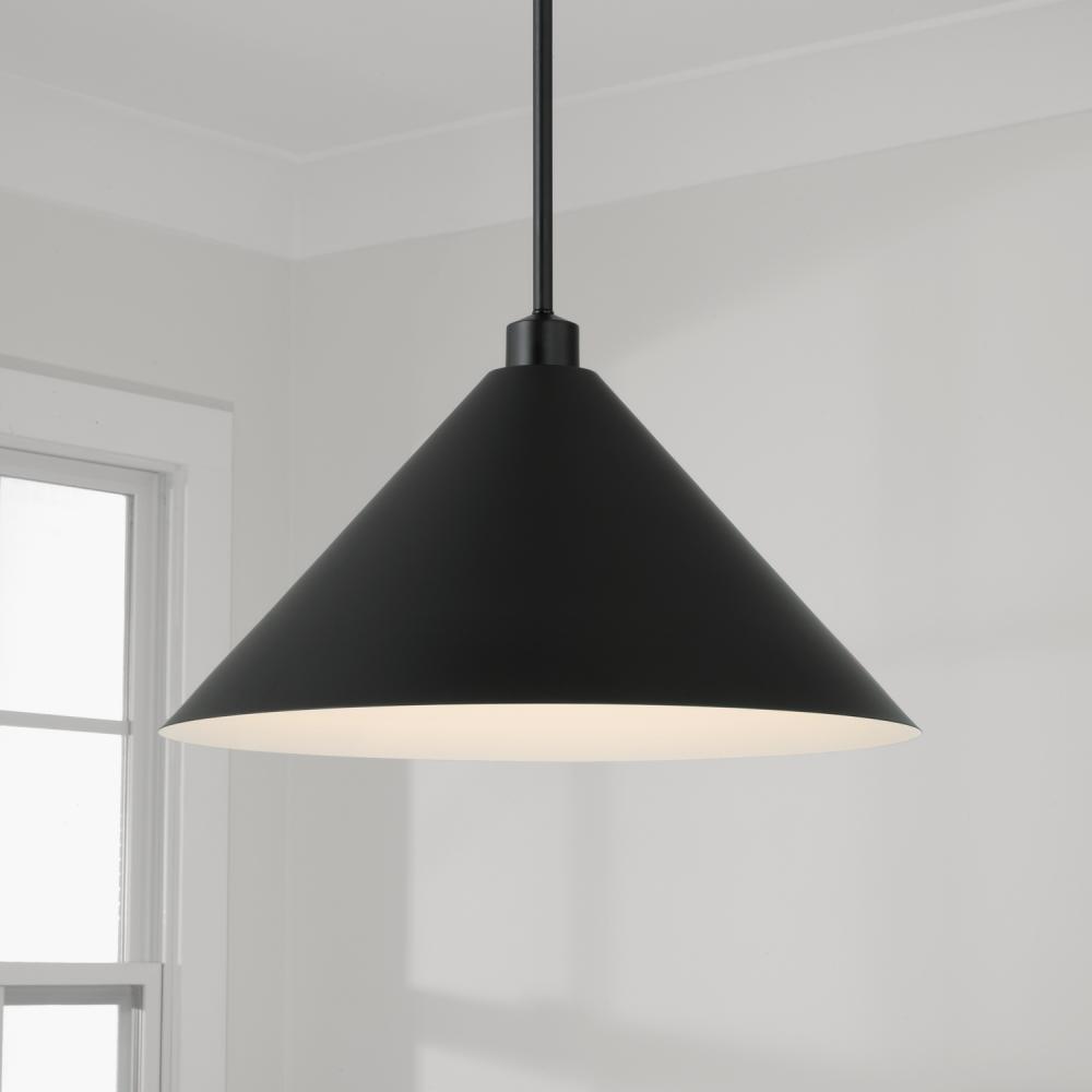 Bring distinct style to any space with the Alden Pendant. The Matte Black finish with White interior delivers a bold contrast, while the crisp, angled metal shades create a modern contour.
