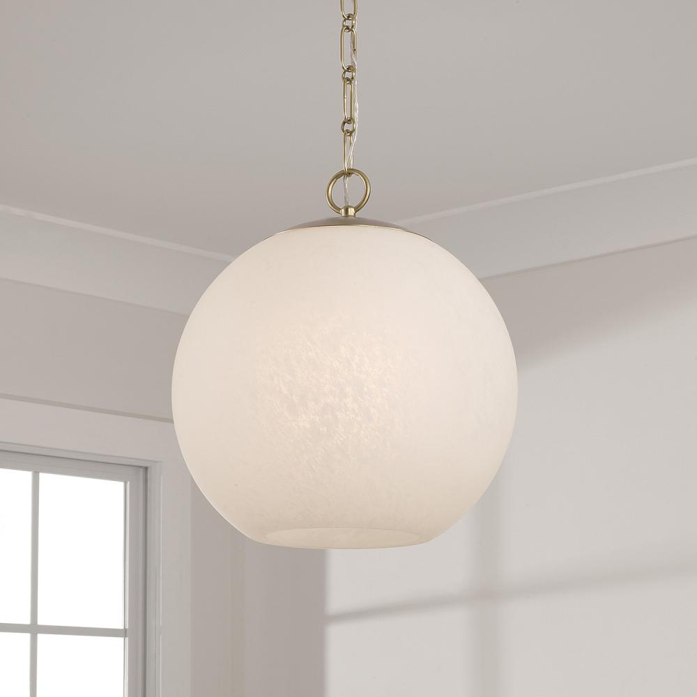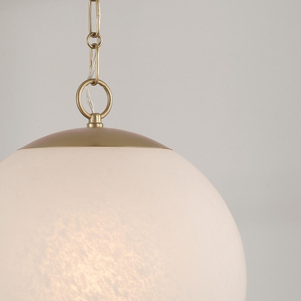DETAILS: Faux Alabaster glass creates a unique, ambient glow that's enhanced by the Matte Brass shine and designer chain.