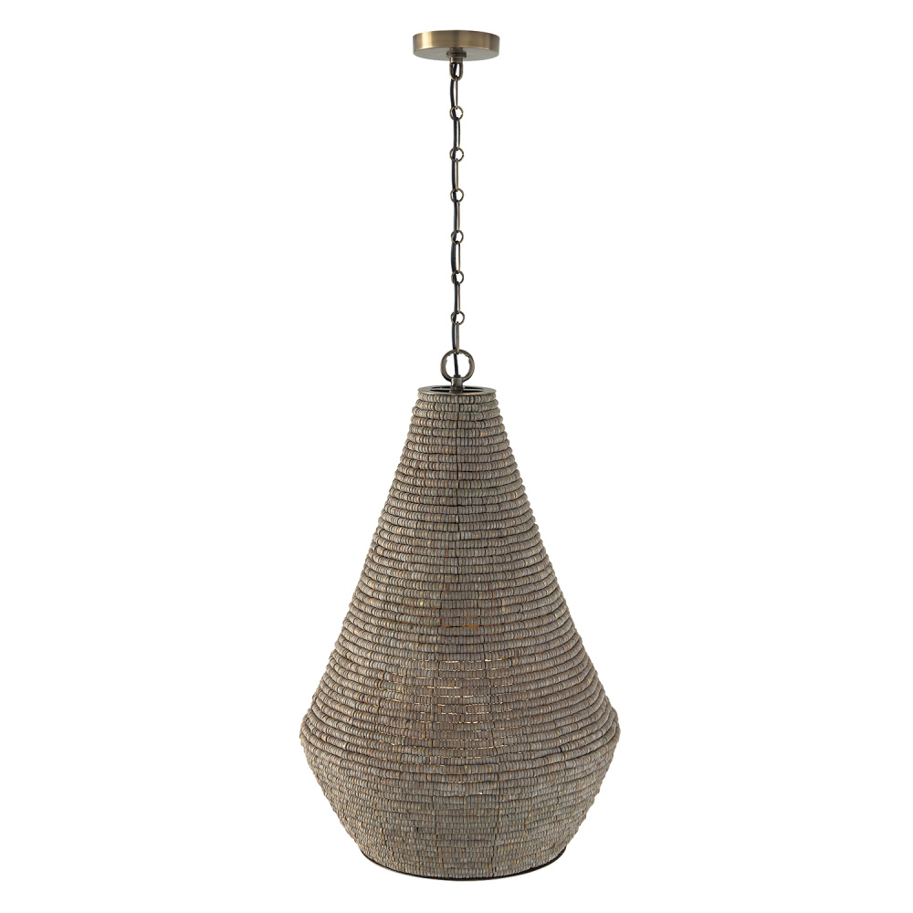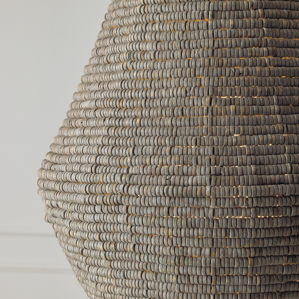 DETAILS: With thousands of hand-strung wooden beads, the open teardrop silhouette takes on a stunning dimensional appeal, complete with an inner Soft White glass globe and an Aegean Grey finish.