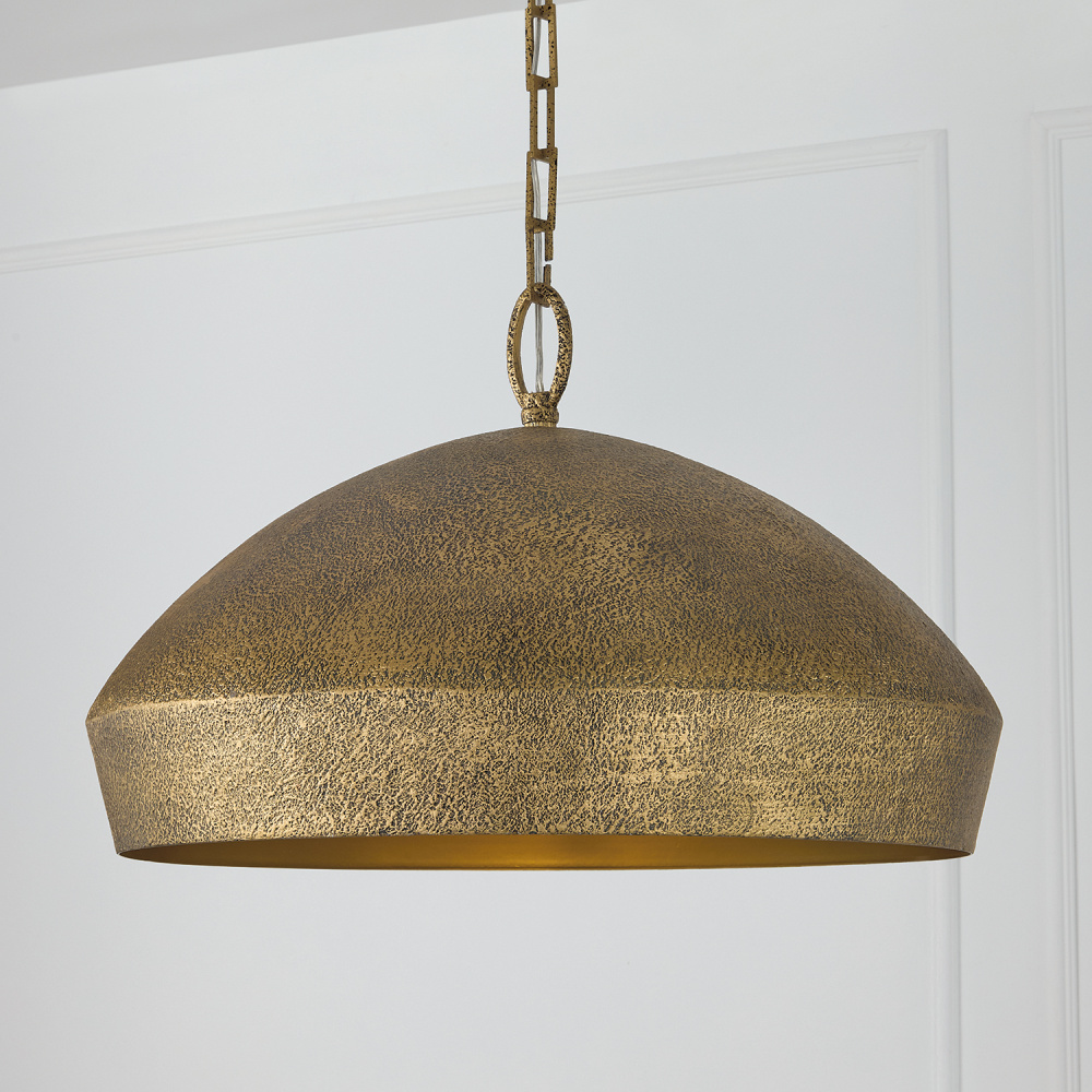 DETAILS: Layers of hand-painted texture bring stunning dimension to the Artisan Gold finish, while the unique dome silhouette and designer chain create elevated style.