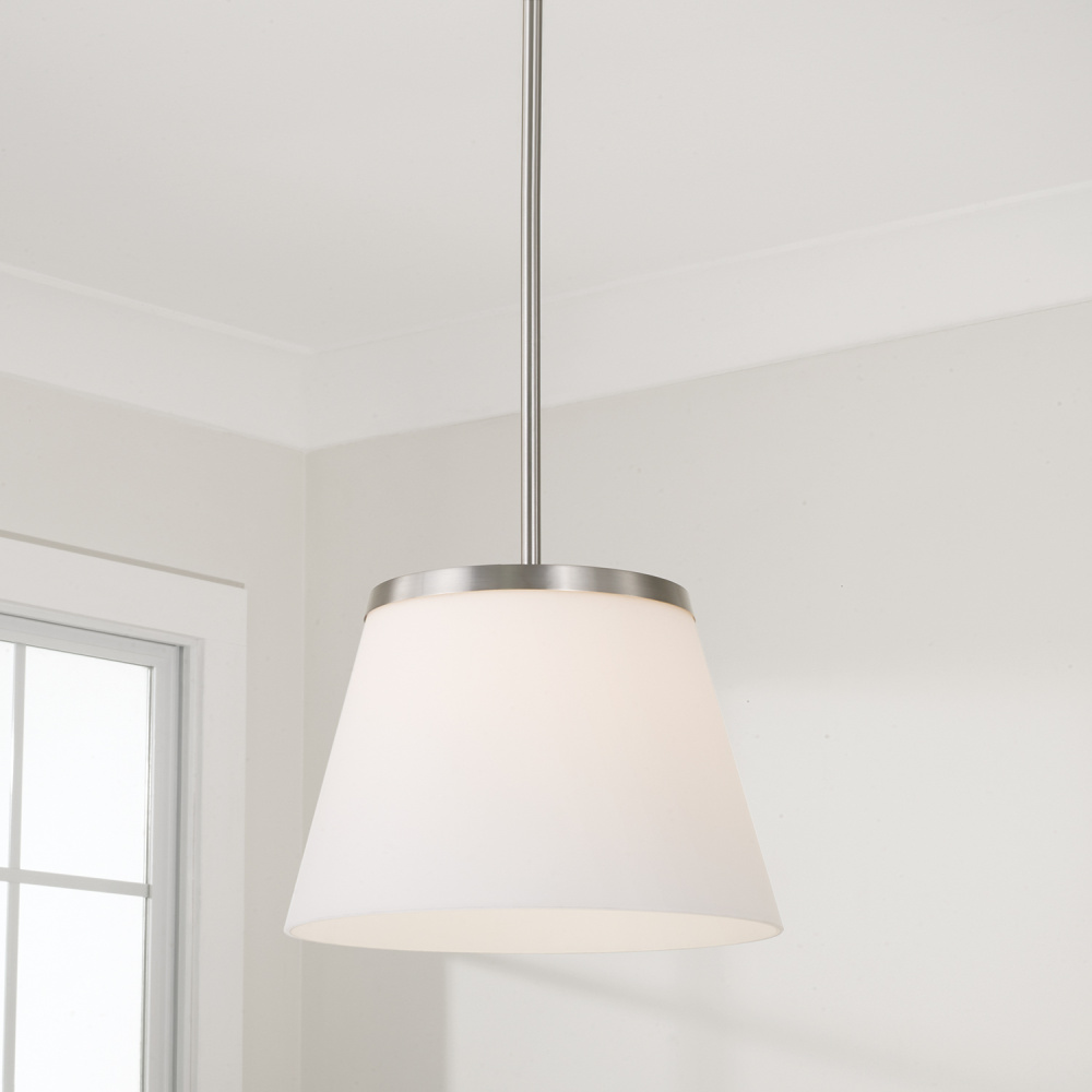 Invite classic style to any space with the Drake Pendant for HomePlace. The tapered Soft White glass shade creates an ambient glow, while the Brushed Nickel finish adds shine to the clean lines.