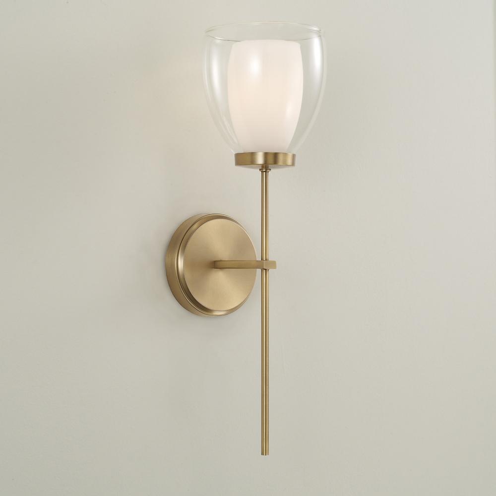 Chic curves and stunning details create the Joss Sconce. The layered Soft White and Clear glass delivers glamorous dimension, while the Aged Brass finish adds visual warmth to the sleek lines for an all-around captivating luminaire.