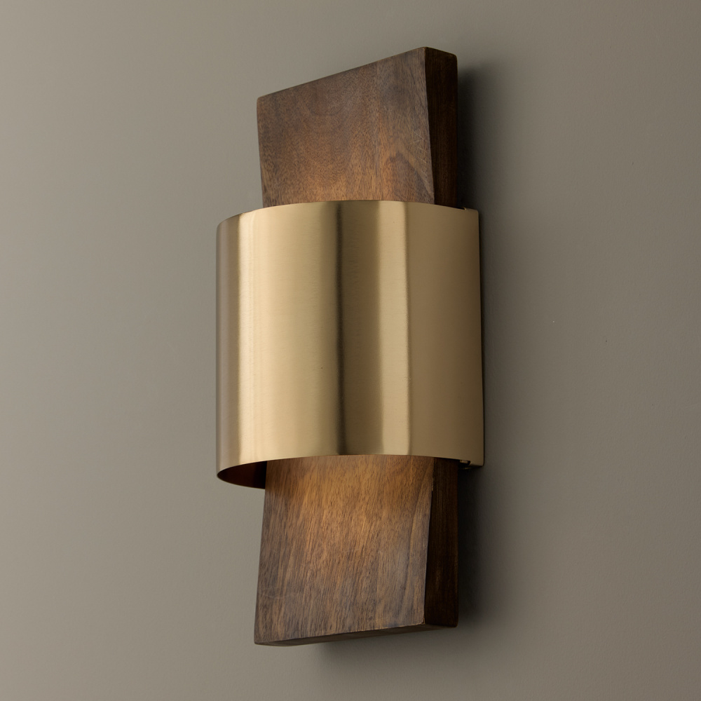 Invite handsome style to any space with the Sidney Sconce. The dark Nordic stained mango wood slab is slightly curved away from the wall to create an elevated, dimensional effect. Beautifully complemented by the bold brass cuff, the natural material is illuminated by the integrated LED of this wall-washing sconces.