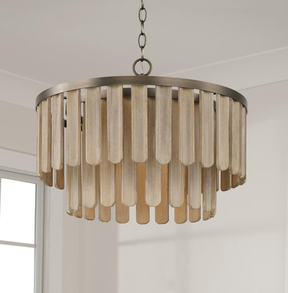 Handcrafted of mango wood, the Jada Dual Mount celebrates muted earthtones and modern organic style. The subtly distressed Nordic Grey wood adornments are carved to bring elegant texture and depth to the tiered form, complemented with the Dark Brass metal frame. Can be hung as a pendant or semi flush.