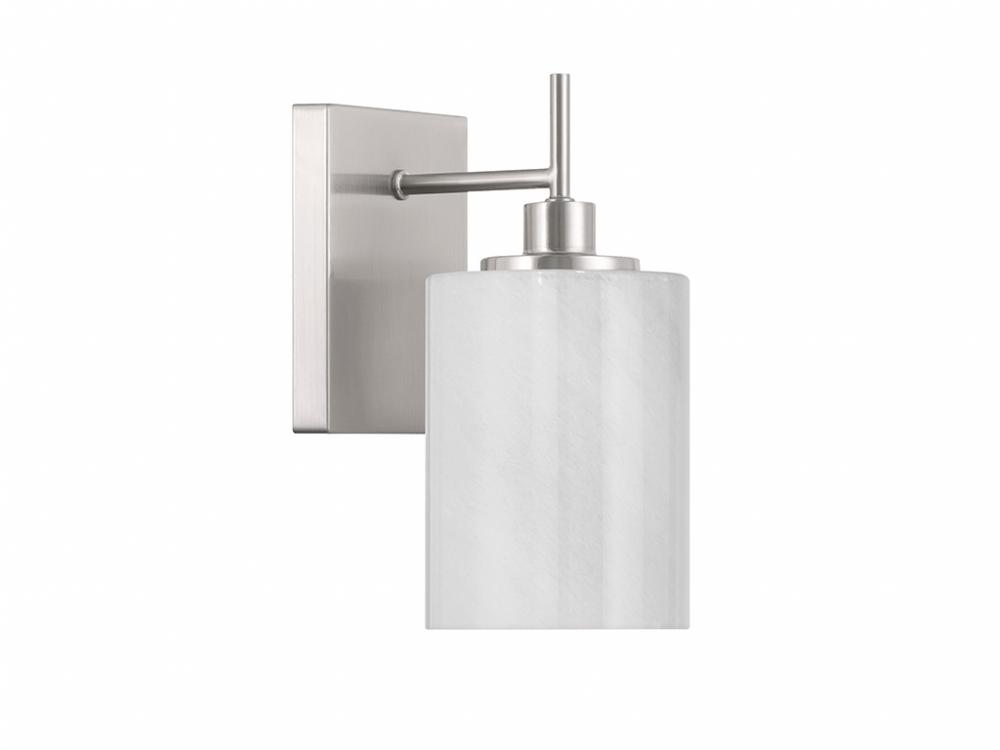 Pep up any room with this simply beautiful 1-light sconce! Its centerpiece is a shade of strie glass featuring dazzling swirls that draw the eye, soften the glow and work beautifully with the Brushed Nickel finish. It is 9.75" in height, 4.75" in width and extends 6.5" from the wall. Uses 1 standard size bulb of up to 60 watts. Bulb not included.