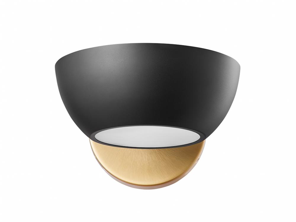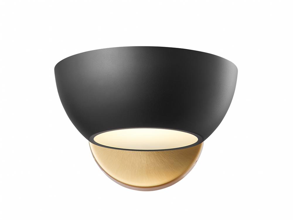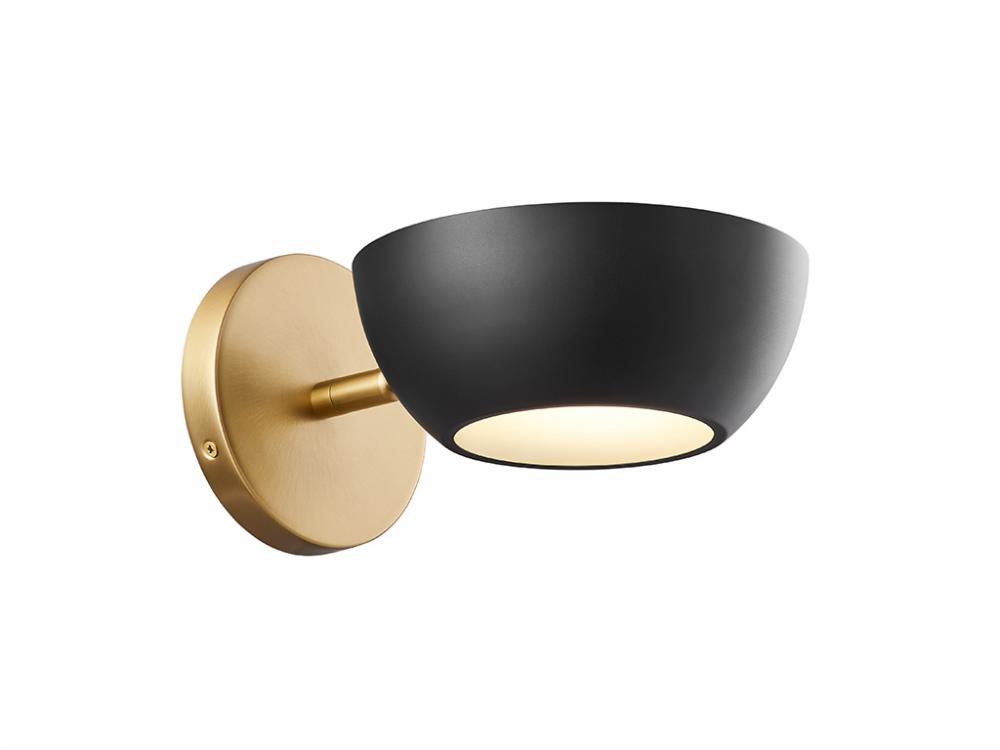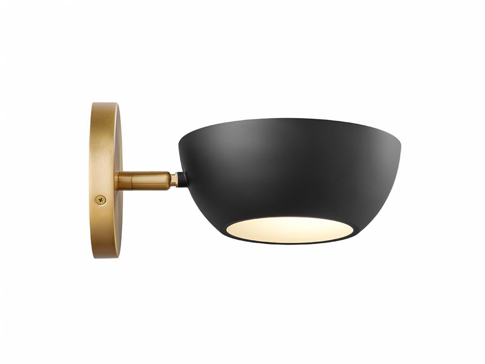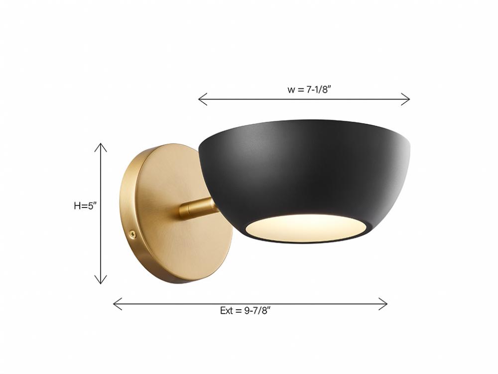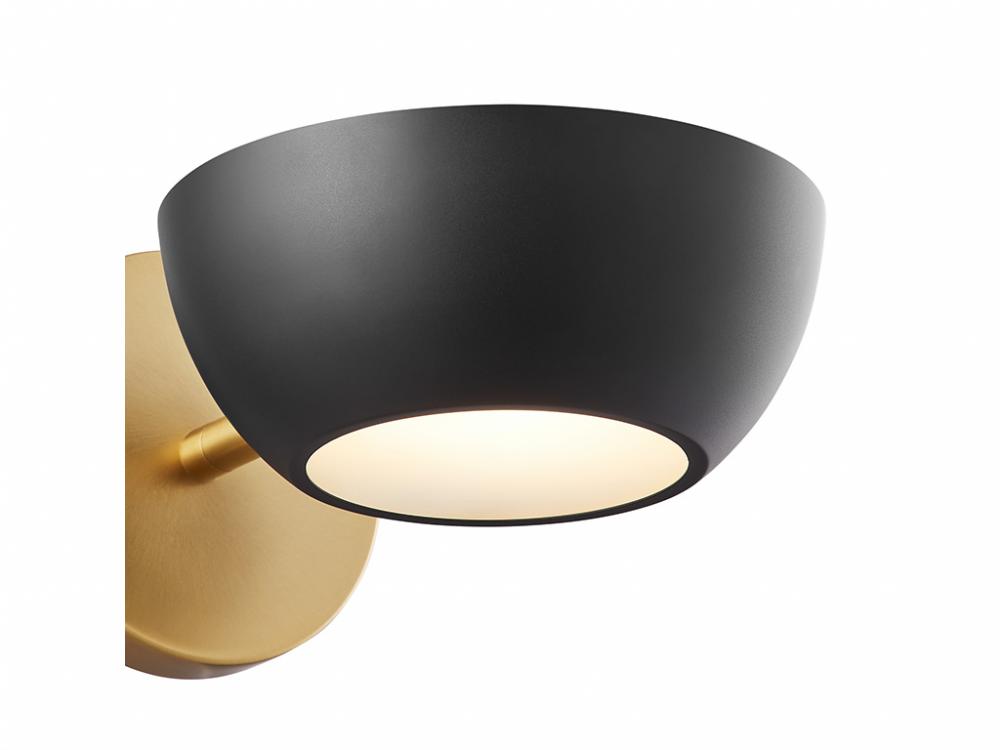 Bring this inventive 1-light sconce into your home and watch it become a conversation starter! Light shines above and below the Matte Black finished cup and the arm is finished in Natural Brass for two-tone appeal. It is 5" in height, 7" in width and extends 9.875" from the wall. Uses one candelabra size bulb of up to 60 watts. Bulb not included. Mount this sconce facing up, as pictured.