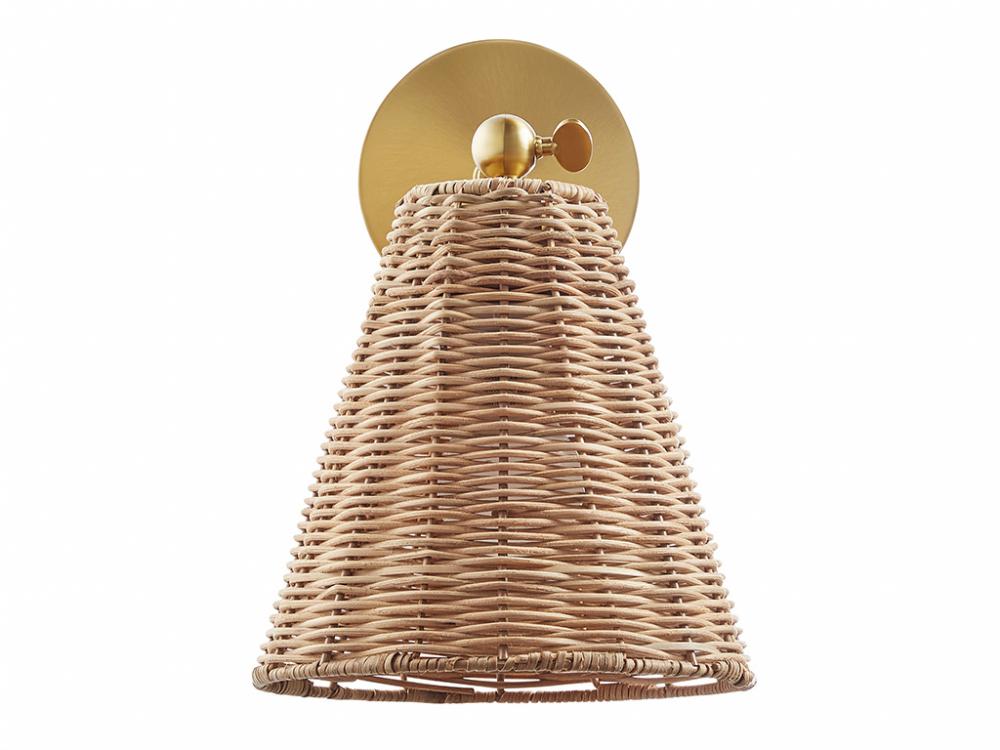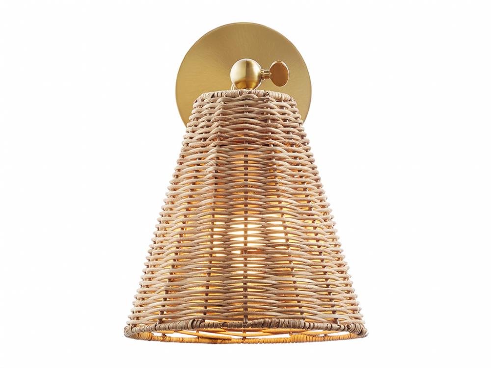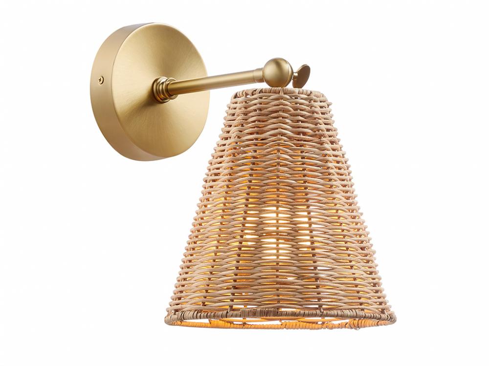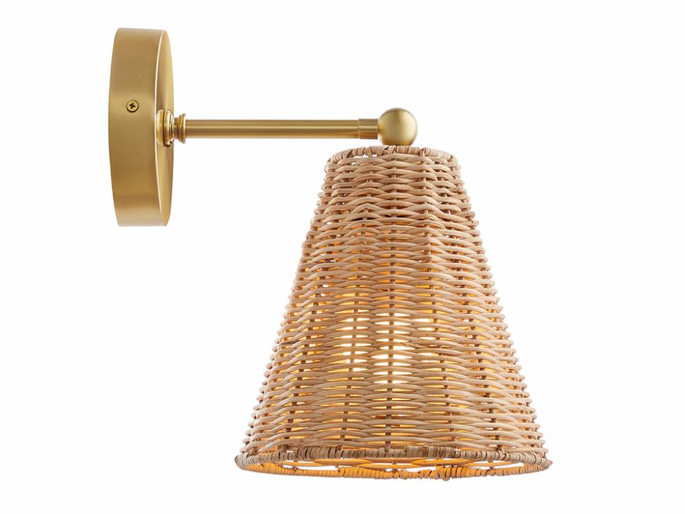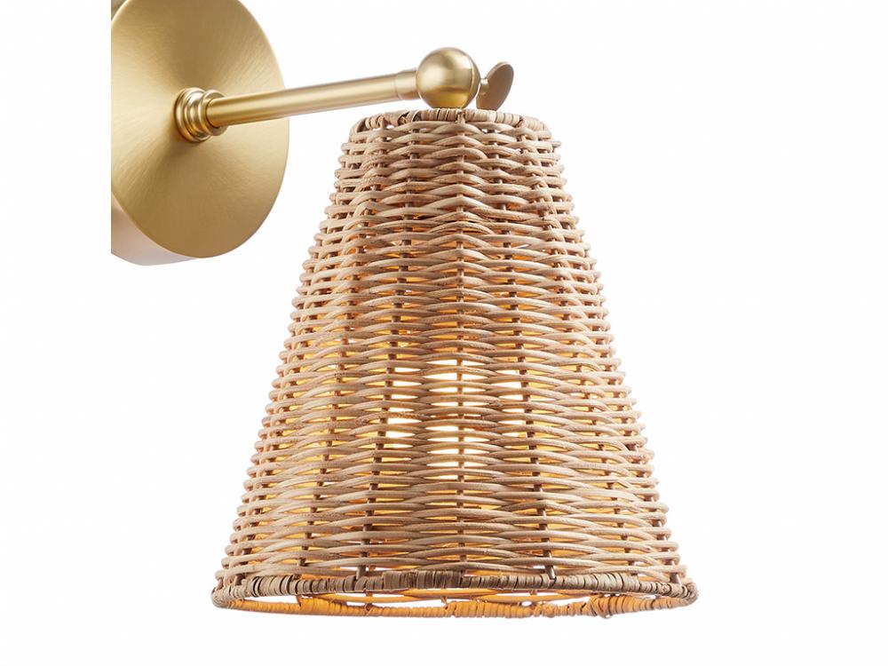 The relaxed vibes of natural rattan are given a touch of glamour in this 2-pack of adjustable sconces. The warm tones of the intricately woven rattan shade matches up nicely with the Natural Brass finish. For added convenience, these sconces can even be plugged in to any standard wall outlet, or you can hard-wire them. Adjust the angle of the shade to suit your lighting needs. Each sconce is 11" in height, 8" in width and extends 11" from the wall. Each sconce uses 1 standard size bulb of up to 60 watts. Bulb not included. Set of 2 sconces.
