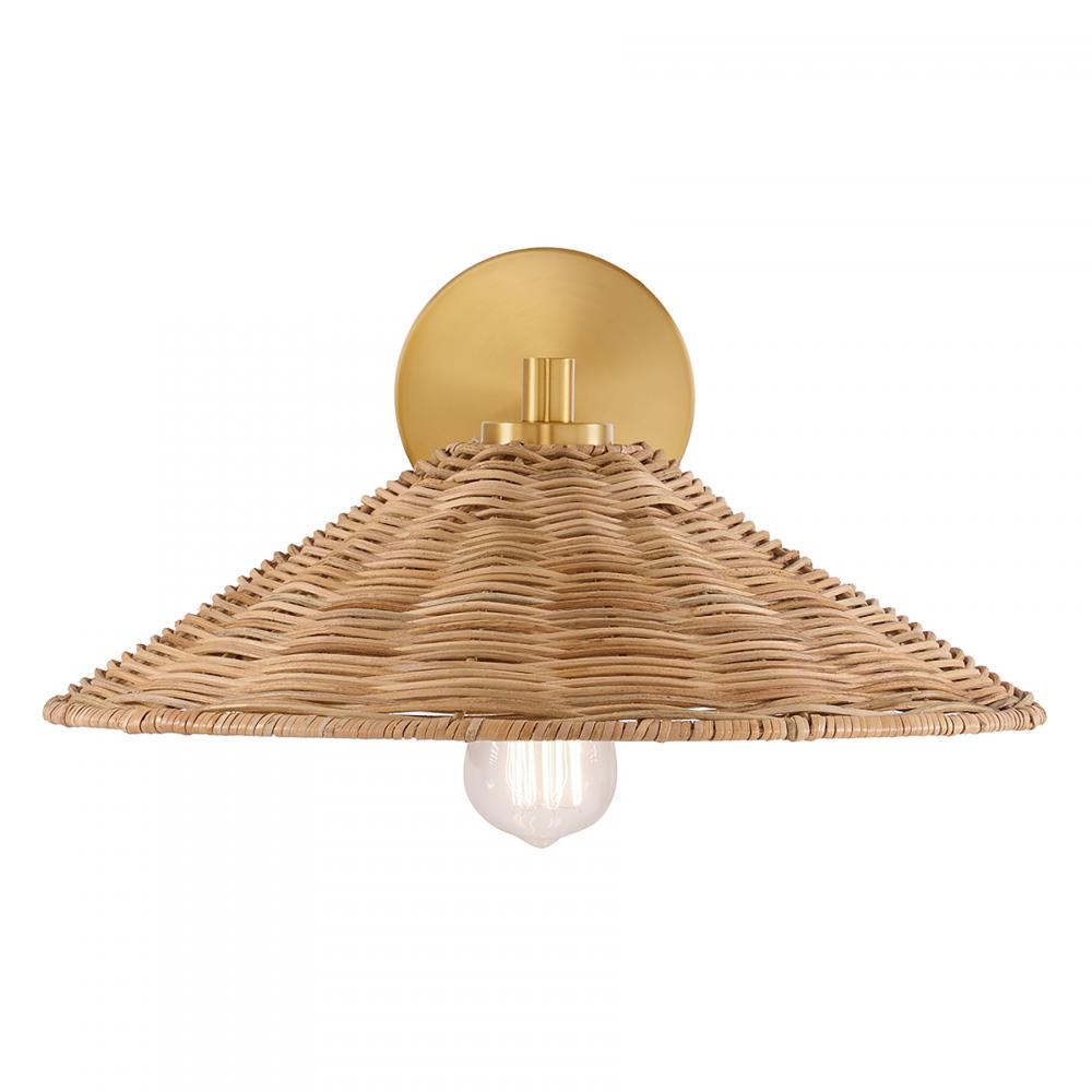 Add a relaxed, natural vibe to any room with this chic 1-light wall sconce. It flaunts a highly textured shade of natural rattan paired with a Natural Brass finish, bringing in a bold and fashionable flair. 7.5" height, 15" width, extends 16.25" from the wall. Uses one standard size bulb, max 60 watts. LED bulb compatible. Damp area rated.