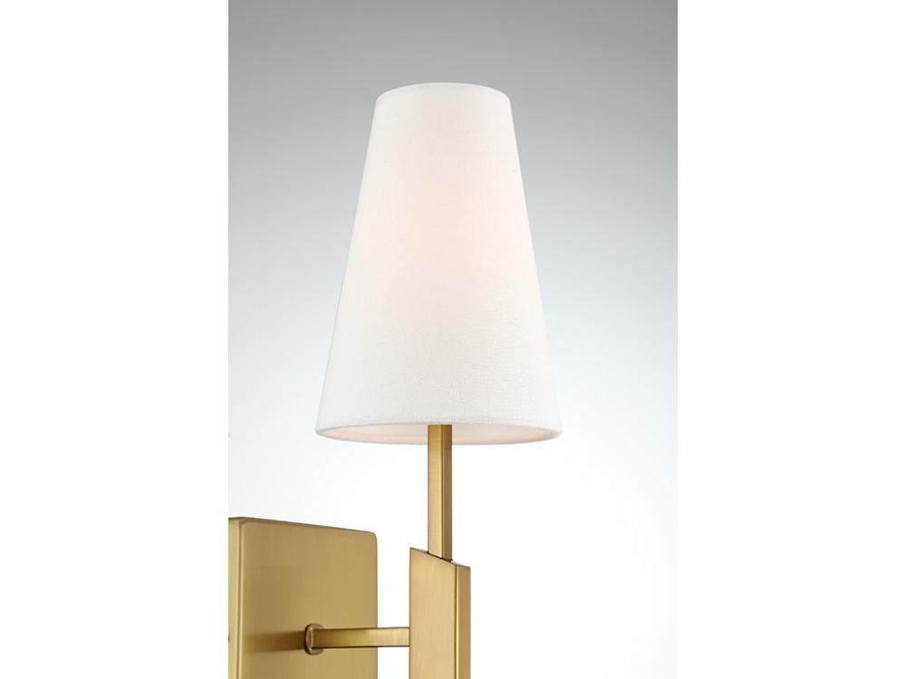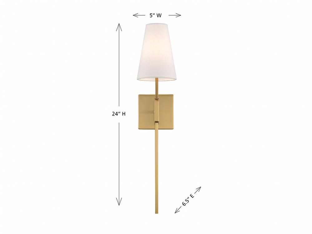If you want to add a touch of chic, classic style to any room, look no further than this 1-light sconce. Finished in Natural Brass, pairing a pencil-sleek body with a bold square backplate and a white linen fabric shade, it is great whether used solo or in groupings. This sconce is 24" in height, 5" in width and extends 6.5" from the wall. It uses 1 candelabra size bulb of up to 60 watts. Bulb not included.