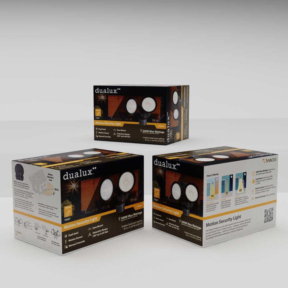 This 2-light outdoor motion sensor security light provides low-level approximately 30% ambient lighting throughout the night and bright 100% high level when motion is detected. The light heads and sensor are fully adjustable to keep your home’s exterior brighter at dusk, dimmer at night, and instantly bright when motion is detected. Customize your lighting options with 5 modes of operation plus adjustable motion sensor sensitivity. Suitable for wall or eave mounting with a wide detection area of 240 degrees and 85 feet. This Dualux security flood light expands the functionality, safety, and security of your home’s outdoor spaces with bright, reliable light when and where it is needed most.