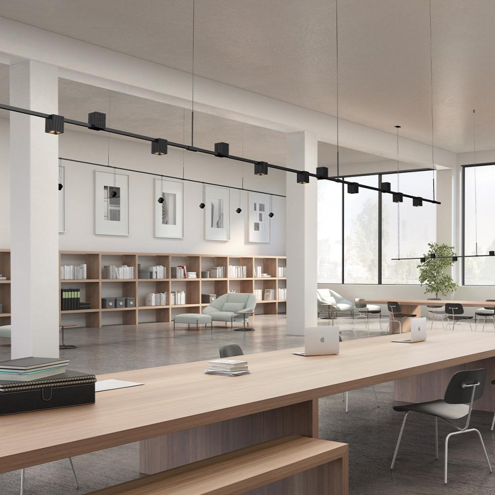 Power Precise Direct Mount Cubes are crisply fit along this In-Line Linear Power Bar configuration in both up and down orientations. Also available as Suspended and Aimable Cubes, the geometry of which reinforces the context of this geometrically modern space.