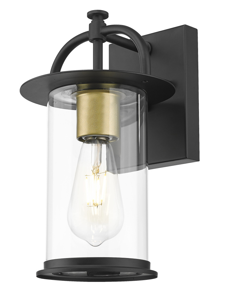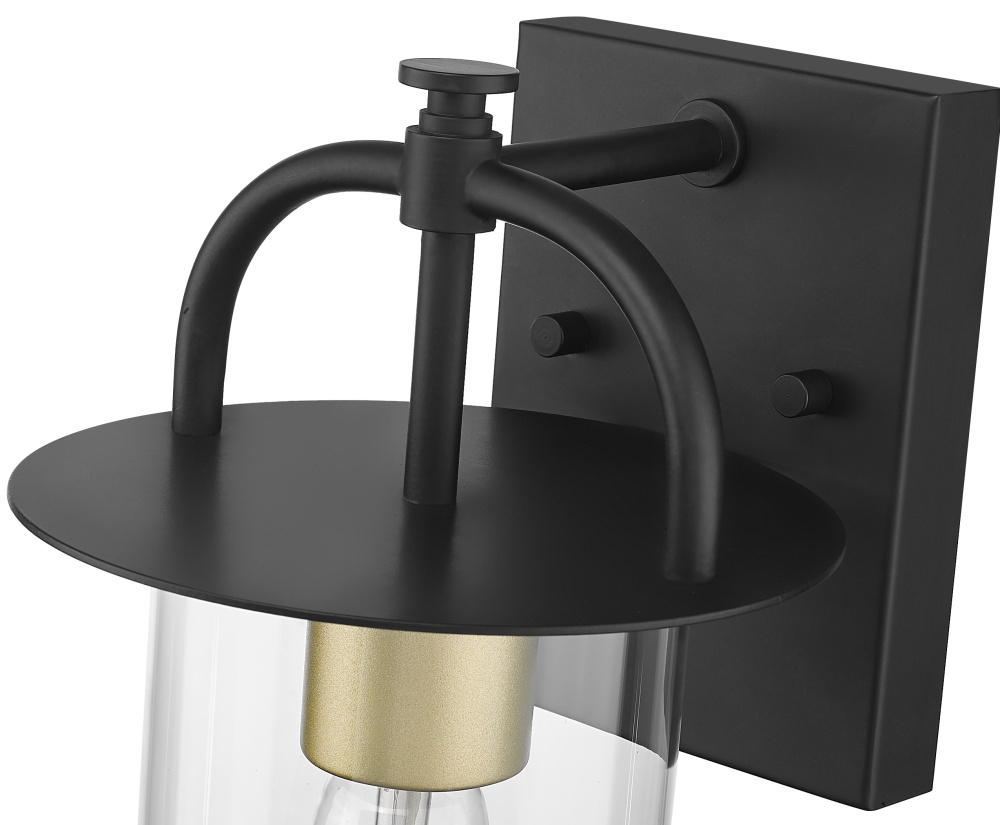 From Acclaim Lighting, this outdoor wall light fixture offers a stylized traditional look for your home. It comes in a black finish steel frame and brass accent, with clean lines and a curved top, that form an eye-catching silhouette. Clear glass allows for optimal illuminatuion.