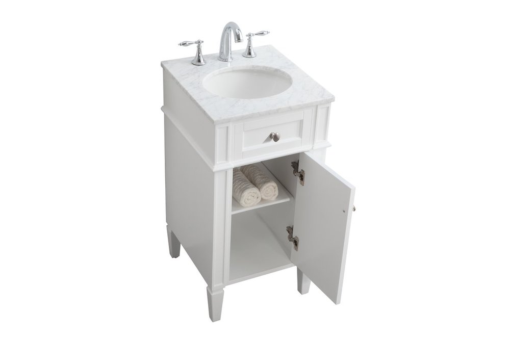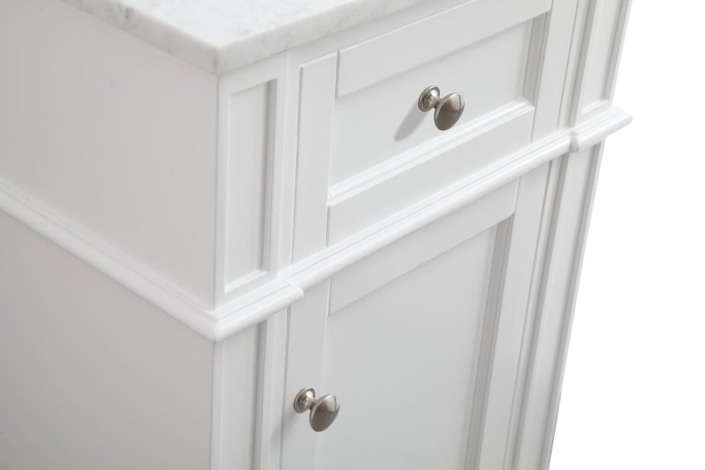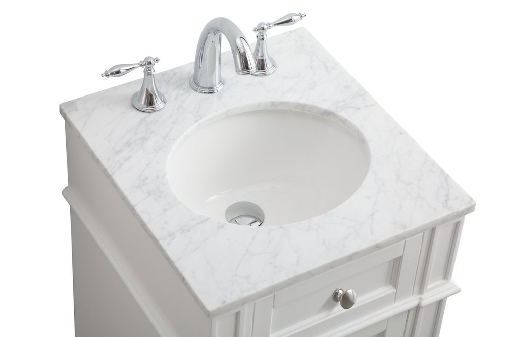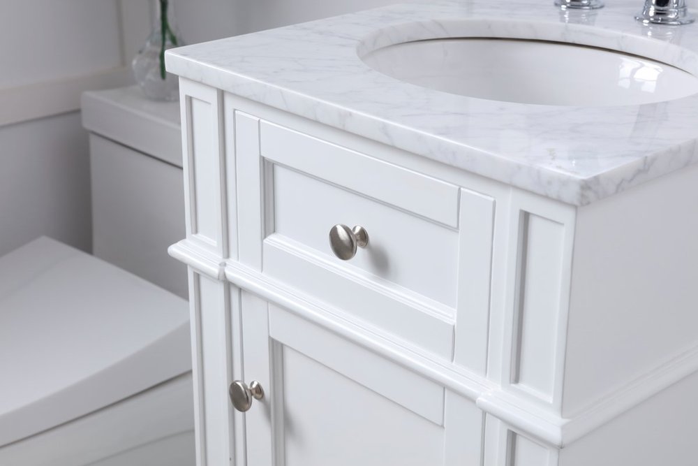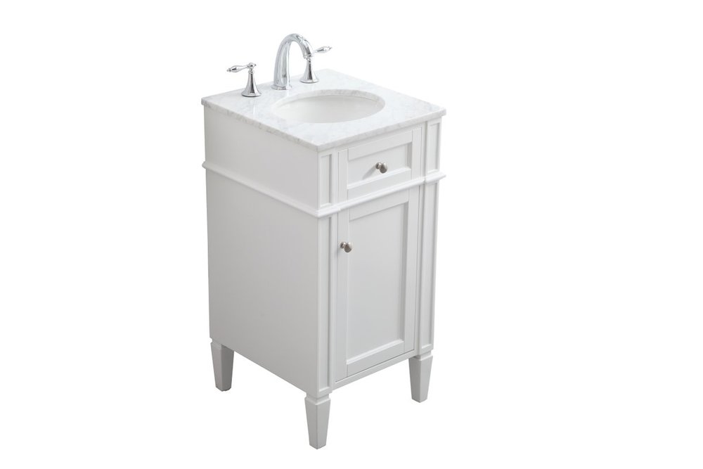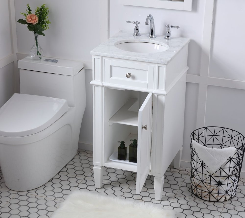 From its Italian Carrara white marble top to its contemporary style handpainted white cabinet, it is sure to enhance either your home or office bathroom. Beneath its lustrous, natural stone marble top is an oval, white porcelain under-mount sink, a handsome Single door cabinet with a Single shelf, for storing all your bathroom essentials and an array of niceties: chrome steel knobs, soft-closing doors and elegantly tapered legs. A wonderful balance of beautiful form and practical function! ·Measurements: W18” x 19” x H35”