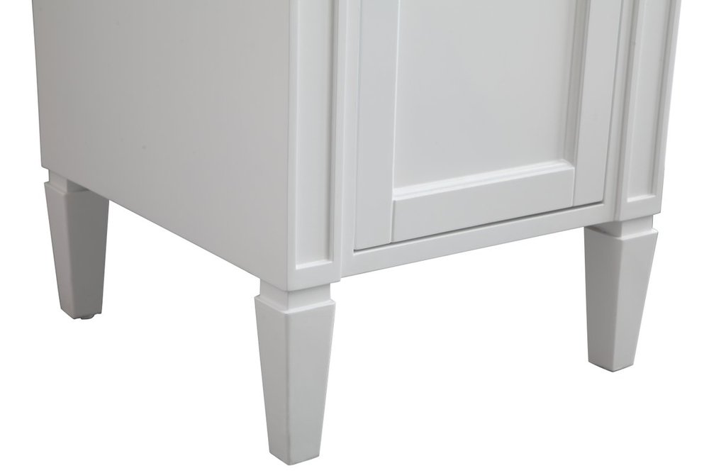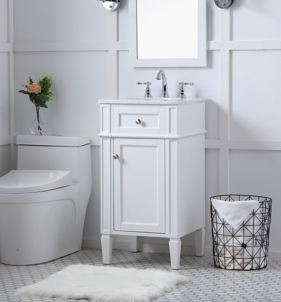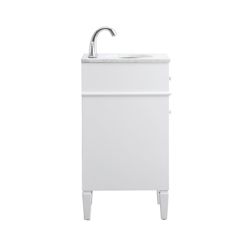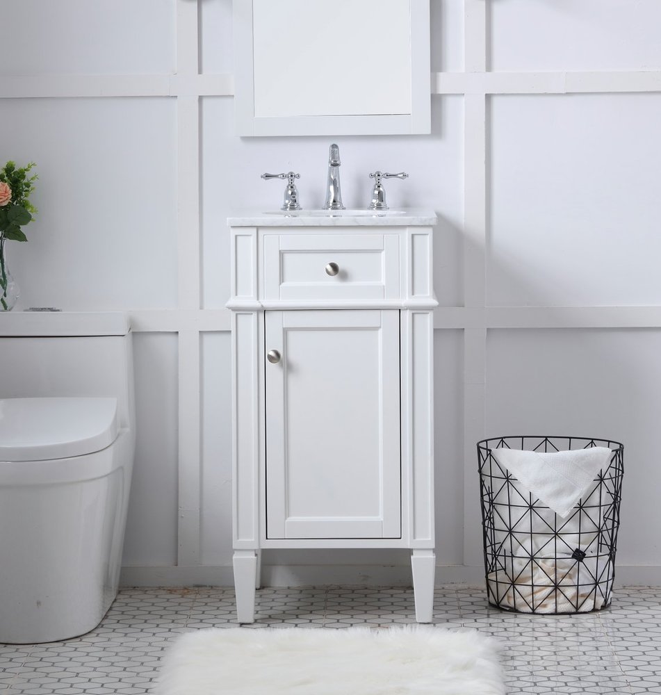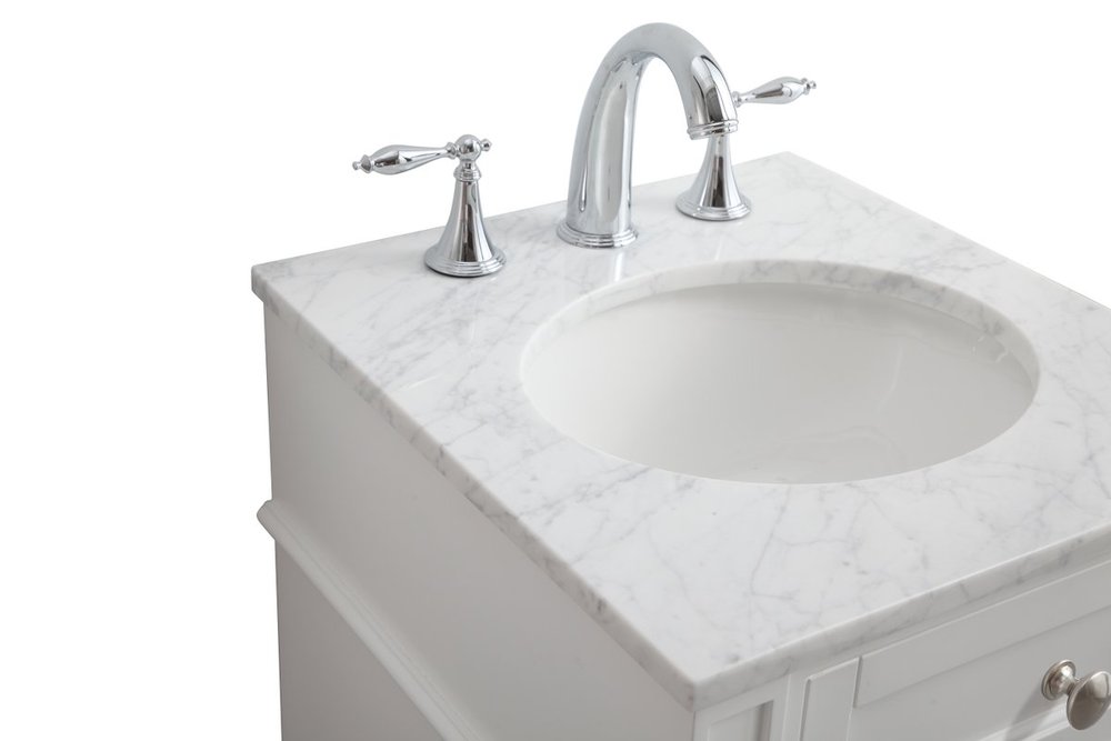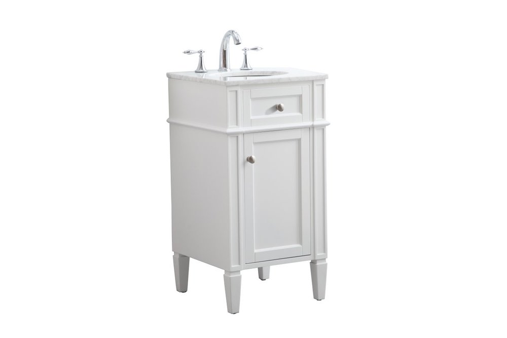 From its Italian Carrara white marble top to its contemporary style handpainted white cabinet, it is sure to enhance either your home or office bathroom. Beneath its lustrous, natural stone marble top is an oval, white porcelain under-mount sink, a handsome Single door cabinet with a Single shelf, for storing all your bathroom essentials and an array of niceties: chrome steel knobs, soft-closing doors and elegantly tapered legs. A wonderful balance of beautiful form and practical function! ·Measurements: W18” x 19” x H35”