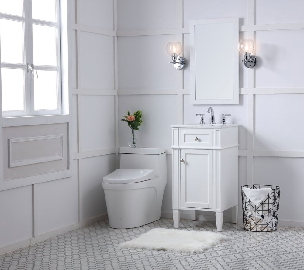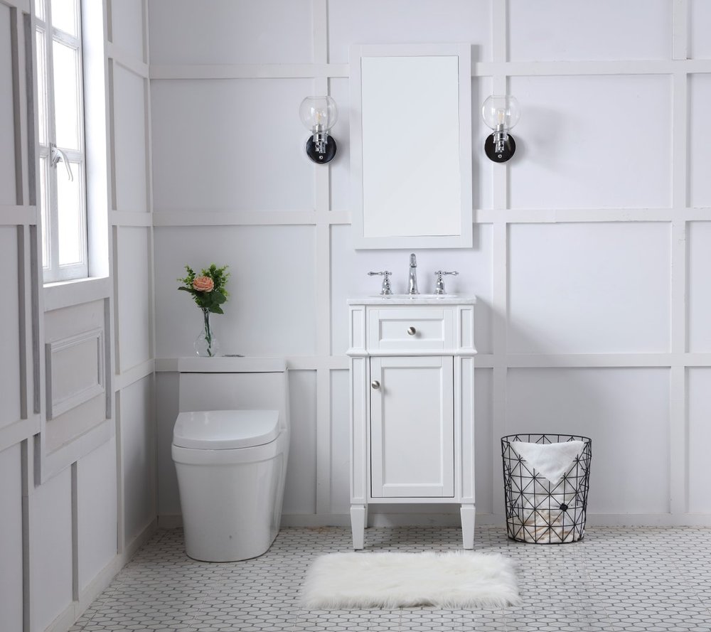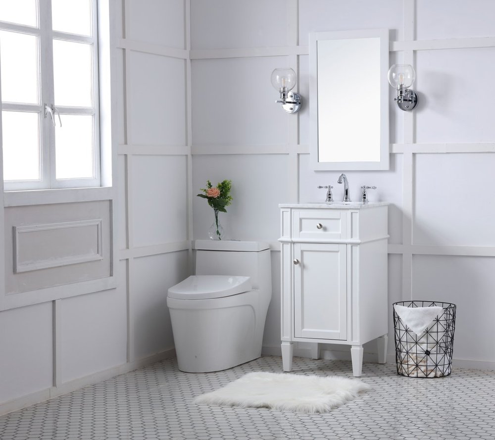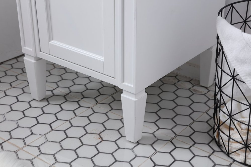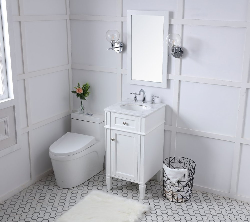 From its Italian Carrara white marble top to its contemporary style handpainted white cabinet, it is sure to enhance either your home or office bathroom. Beneath its lustrous, natural stone marble top is an oval, white porcelain under-mount sink, a handsome Single door cabinet with a Single shelf, for storing all your bathroom essentials and an array of niceties: chrome steel knobs, soft-closing doors and elegantly tapered legs. A wonderful balance of beautiful form and practical function! ·Measurements: W18” x 19” x H35”