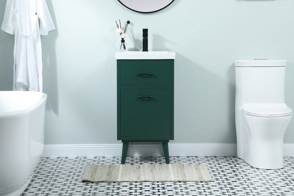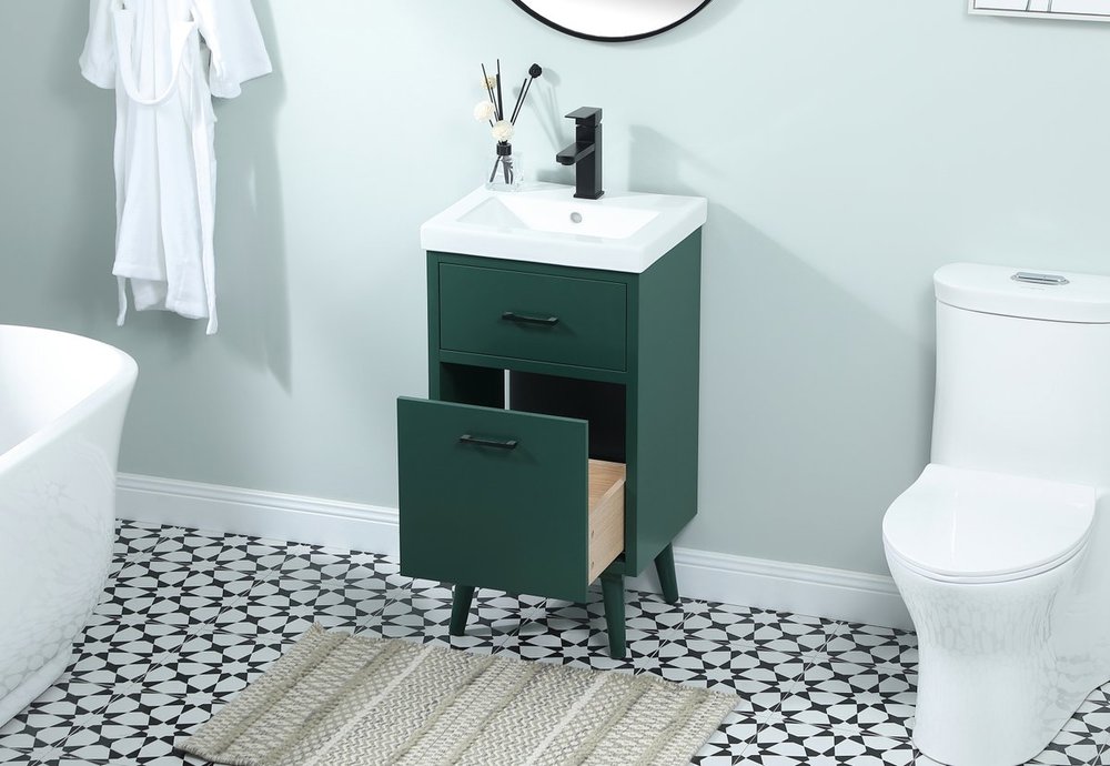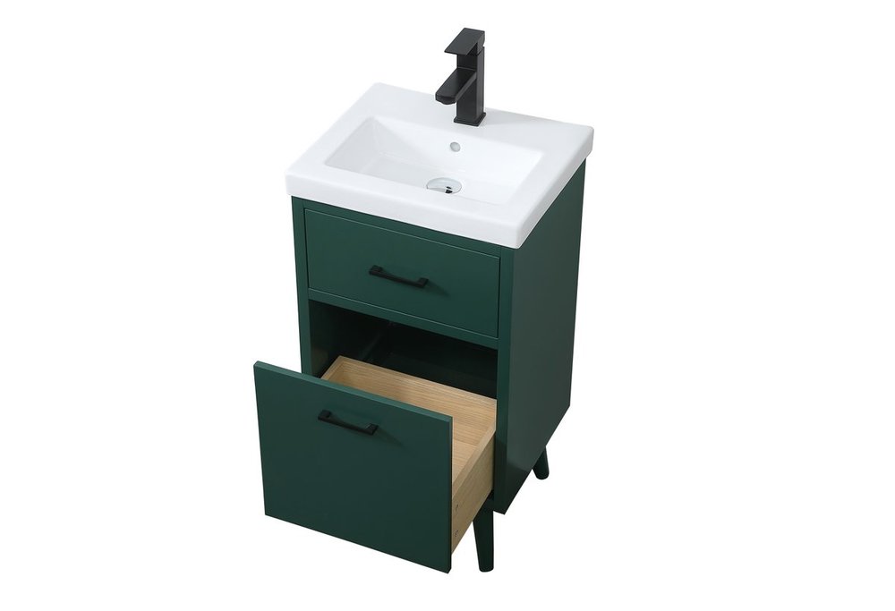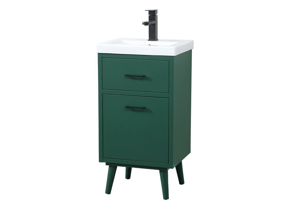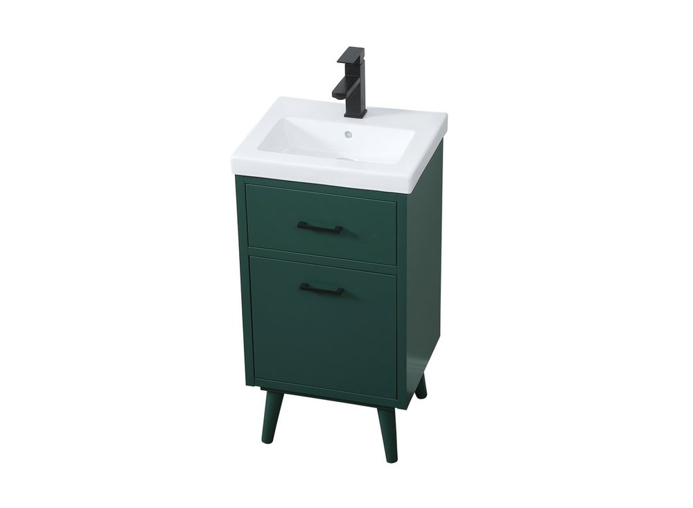 Delve into a world of minimalistic fashion and contemporary styling with this midcentury modern 18" vanity. The clean lines anchors the design, while the oblique tapered cylinder legs add subtle interest. A black handle adorns the top fake drawer hiding the base of the porcelain sink while another one allows you to pull the bottom drawer out, letting you store your bathroom necessities and toiletries. The compact size makes it the perfect vanity for any bathroom or powder room, regardless of size.