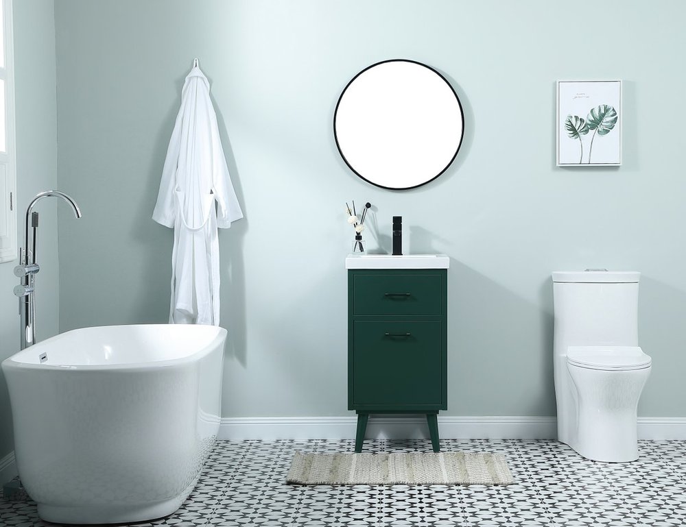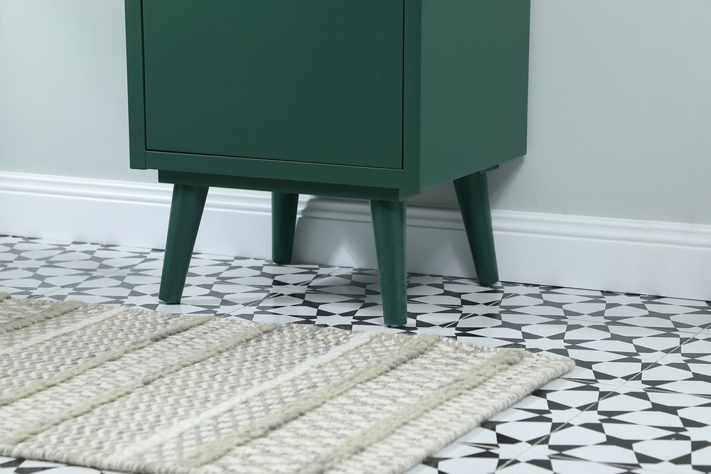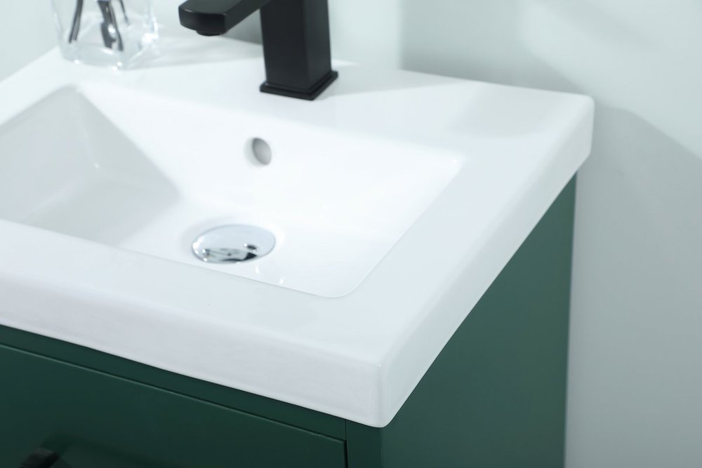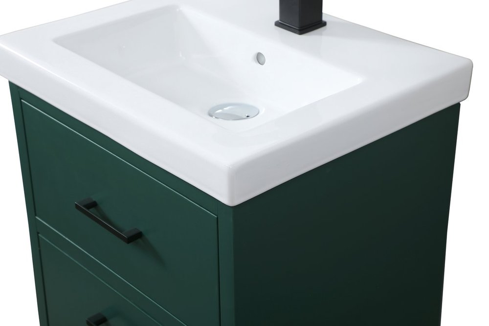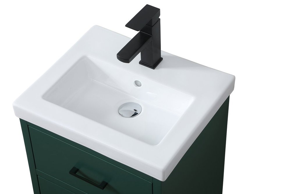 Delve into a world of minimalistic fashion and contemporary styling with this midcentury modern 18" vanity. The clean lines anchors the design, while the oblique tapered cylinder legs add subtle interest. A black handle adorns the top fake drawer hiding the base of the porcelain sink while another one allows you to pull the bottom drawer out, letting you store your bathroom necessities and toiletries. The compact size makes it the perfect vanity for any bathroom or powder room, regardless of size.