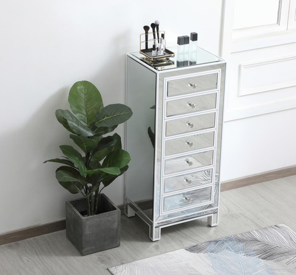 Enhance your bedroom or walk in closet with this fabulous and sophisticated lingerie chest! You can also store your intricate belongings in this petite 7 drawer chest. Dramatic and sophisticated, it has a hand painted finish border, beveled mirror panels on all surfaces, sparkling crystal drawer knobs, and mitered corners.