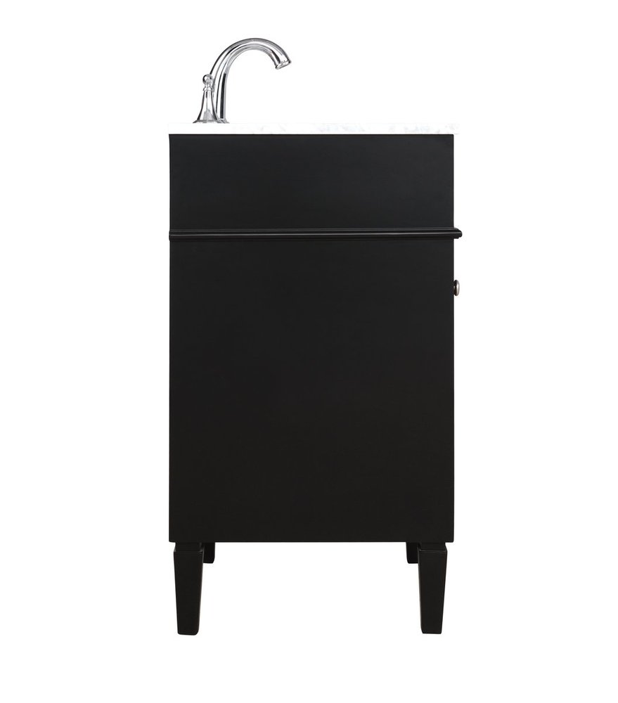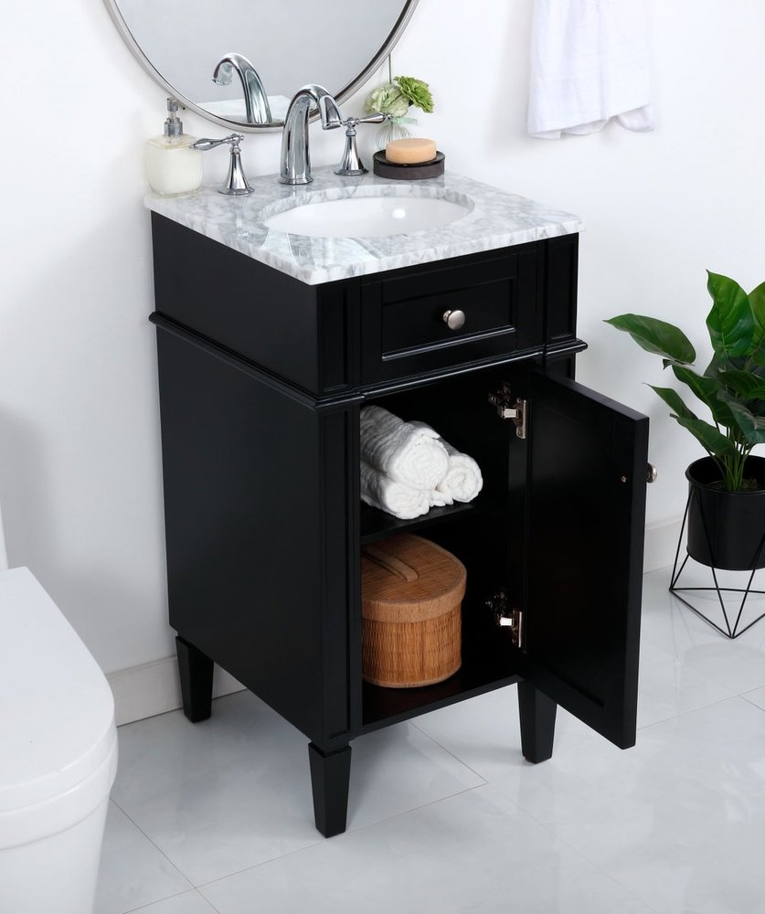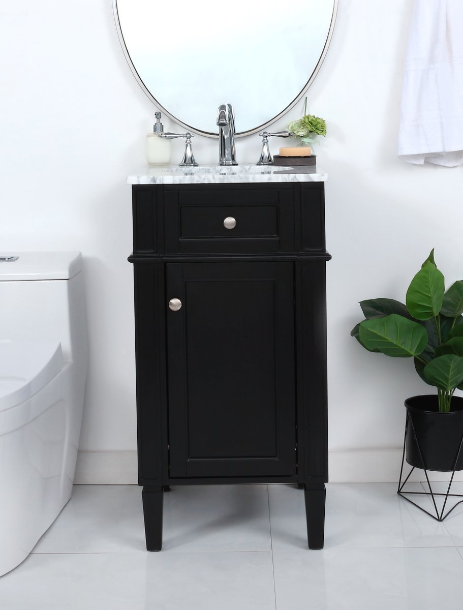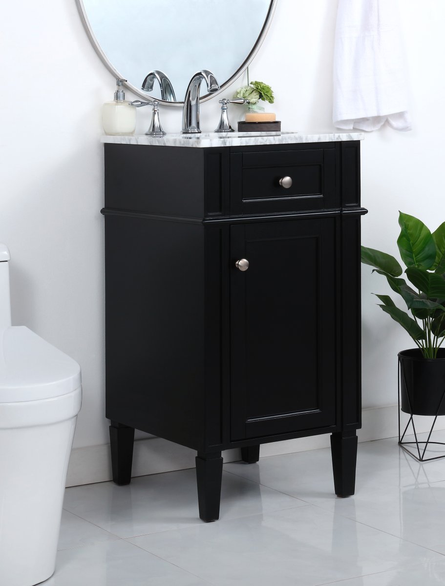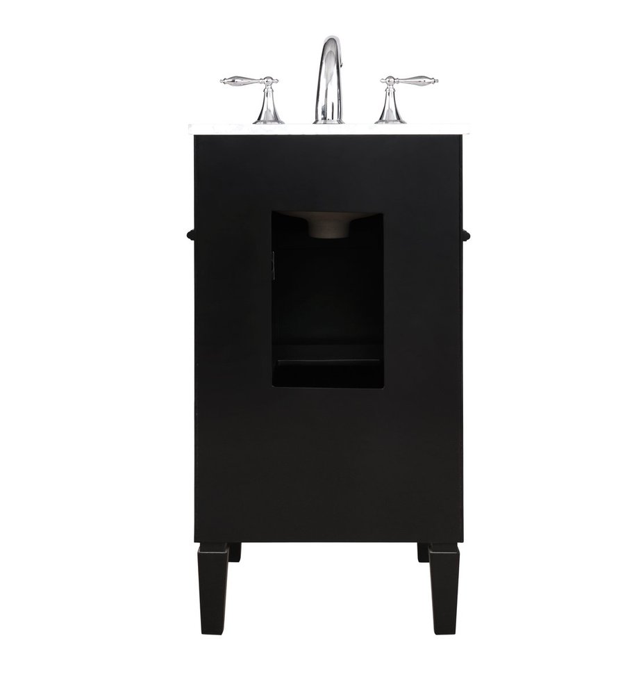Modern sophistication is defined within the black finish and brushed nickel knobs of this compact vanity. Its modest length makes it the perfect addition to any sized home, and saves space with its storage area hidden behind the double cabinet doors. Topped with a Carrara white marble counter top and a porcelain sink, this design will add everlasting class to your bathroom and powder room.