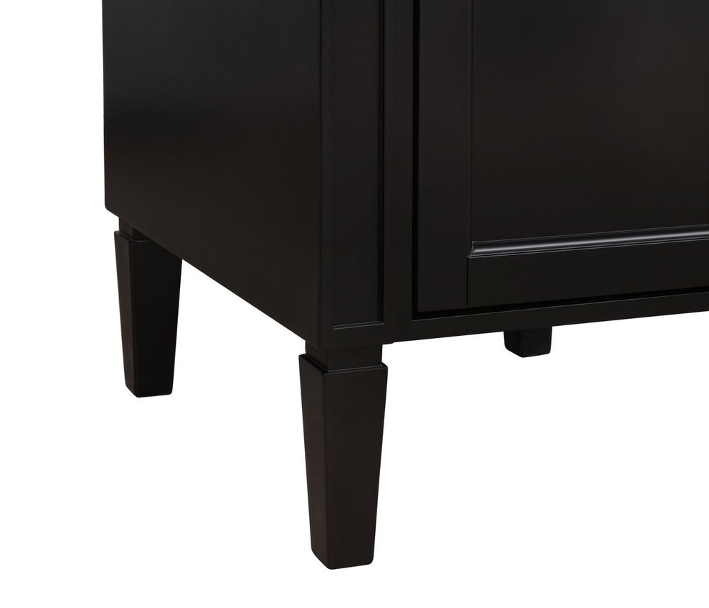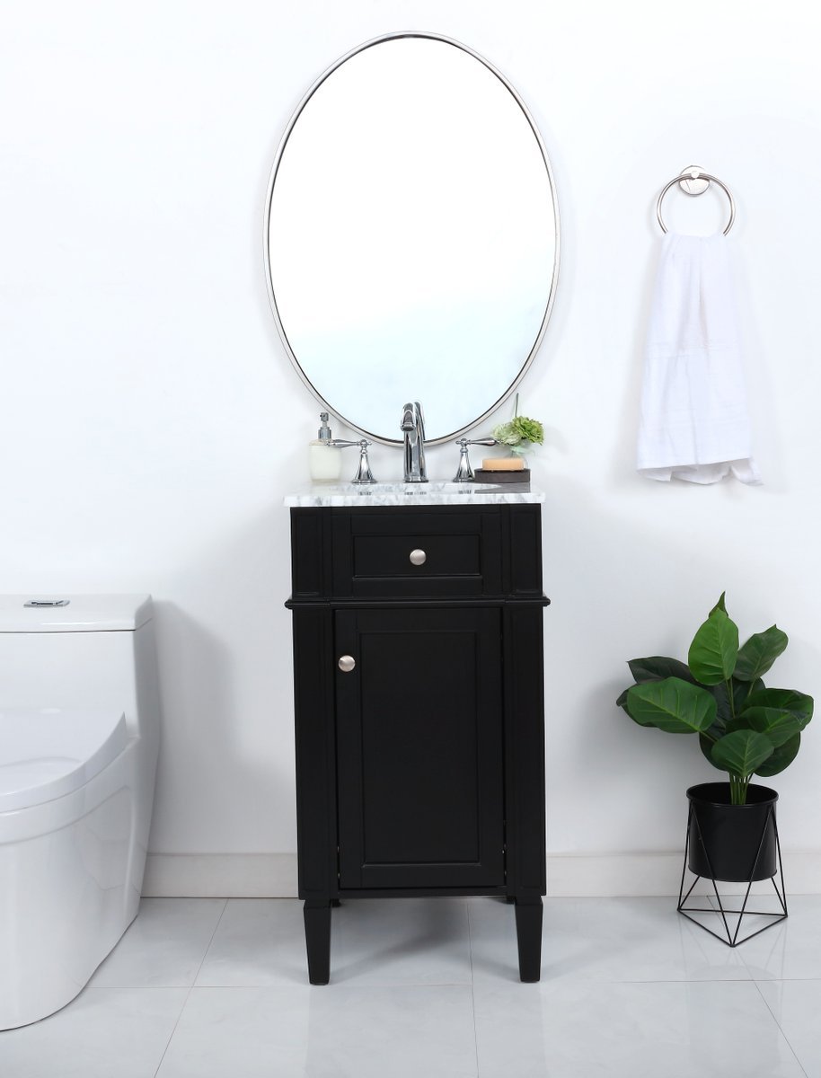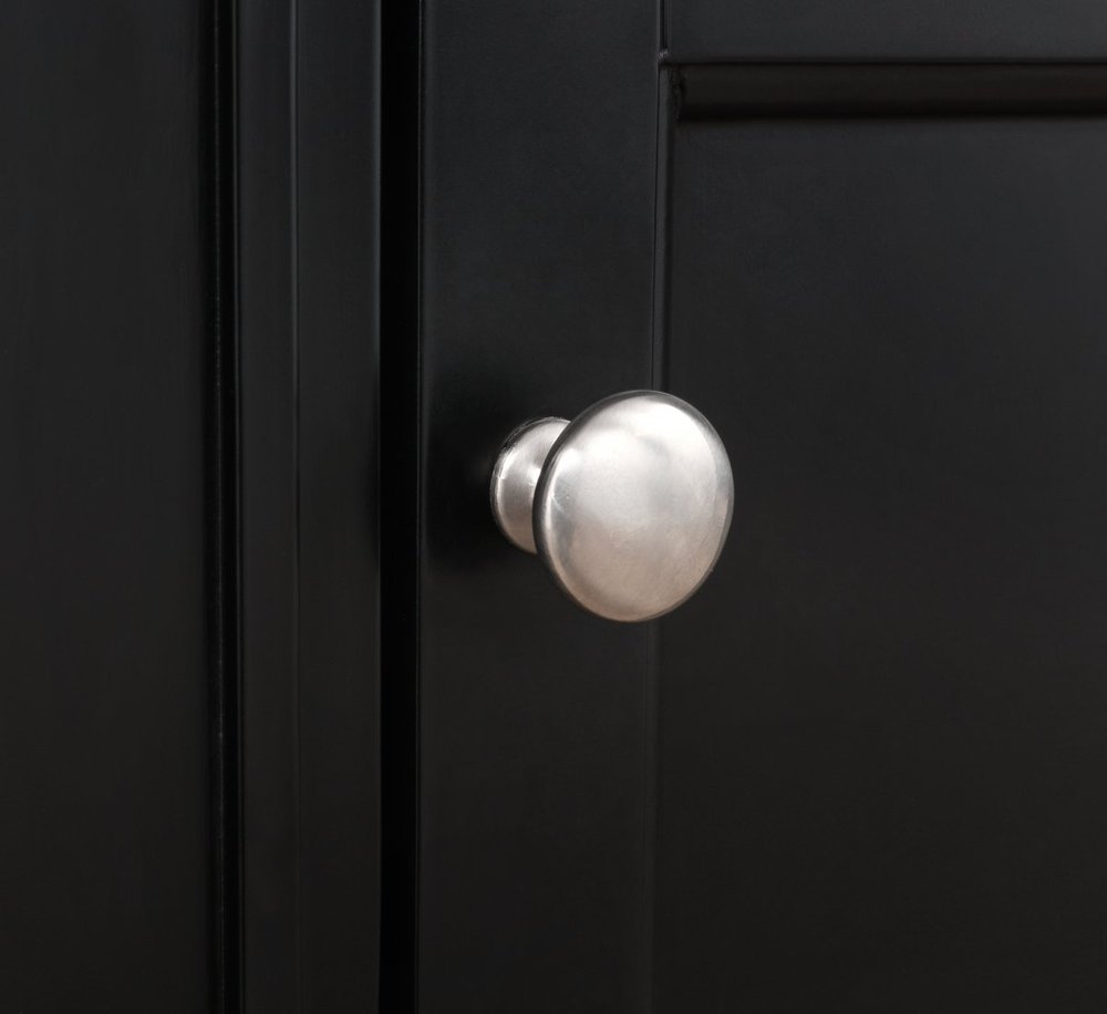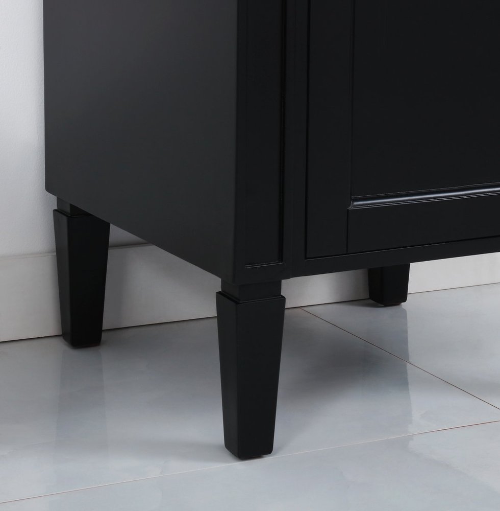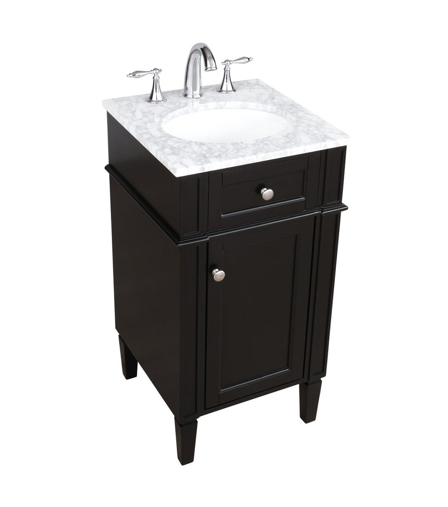 Modern sophistication is defined within the black finish and brushed nickel knobs of this compact vanity. Its modest length makes it the perfect addition to any sized home, and saves space with its storage area hidden behind the double cabinet doors. Topped with a Carrara white marble counter top and a porcelain sink, this design will add everlasting class to your bathroom and powder room.