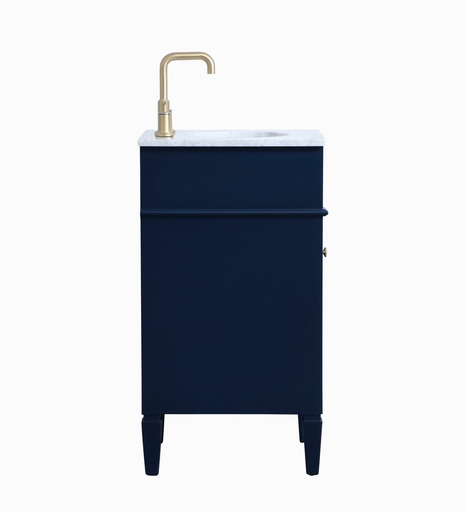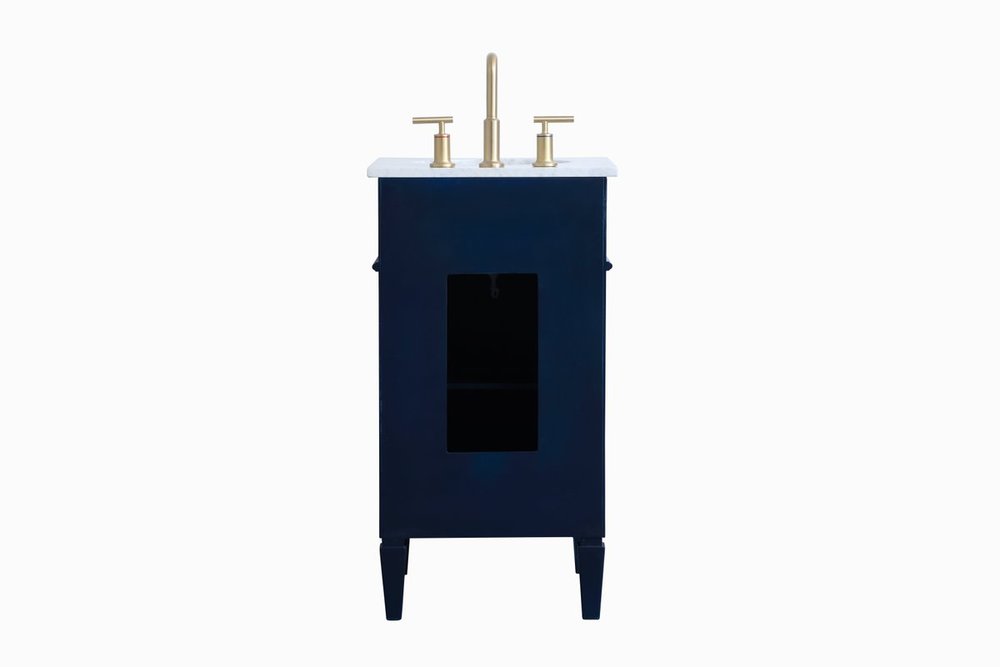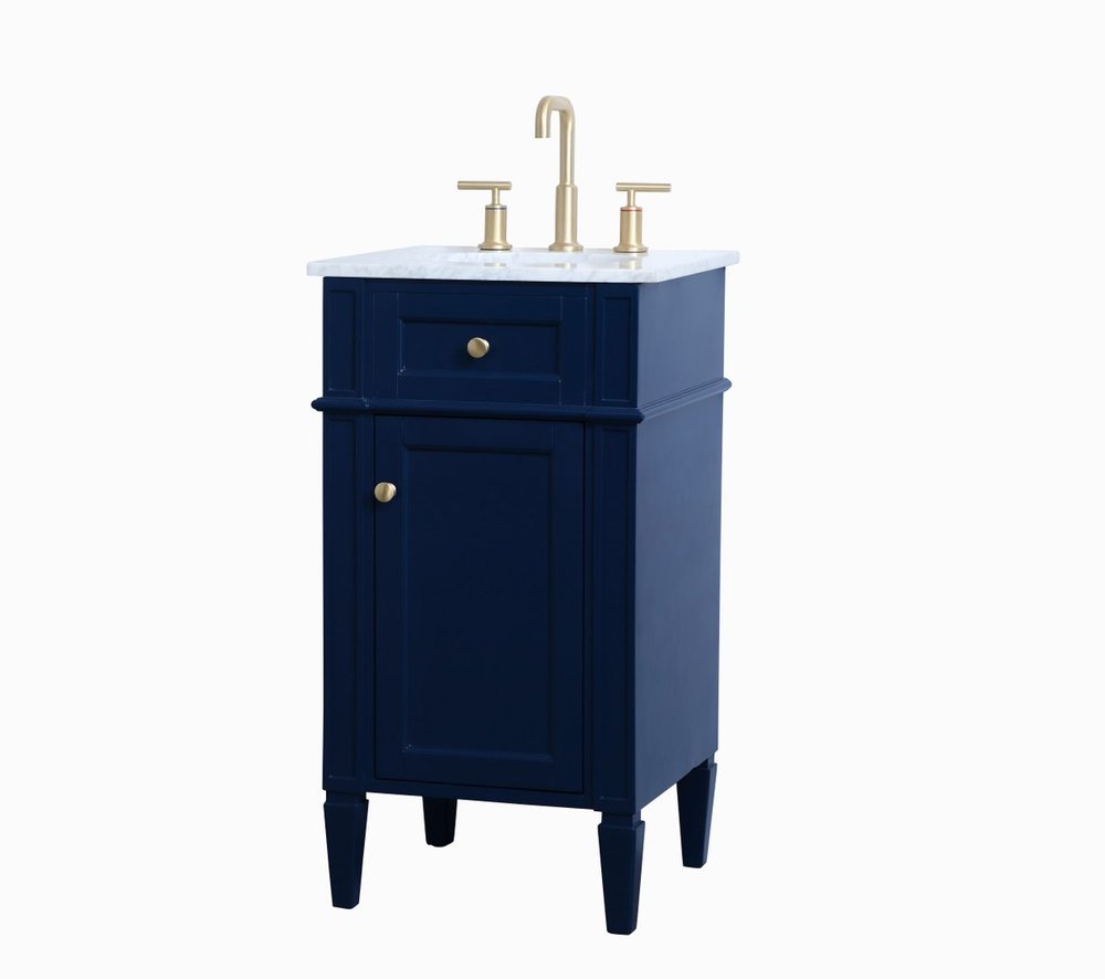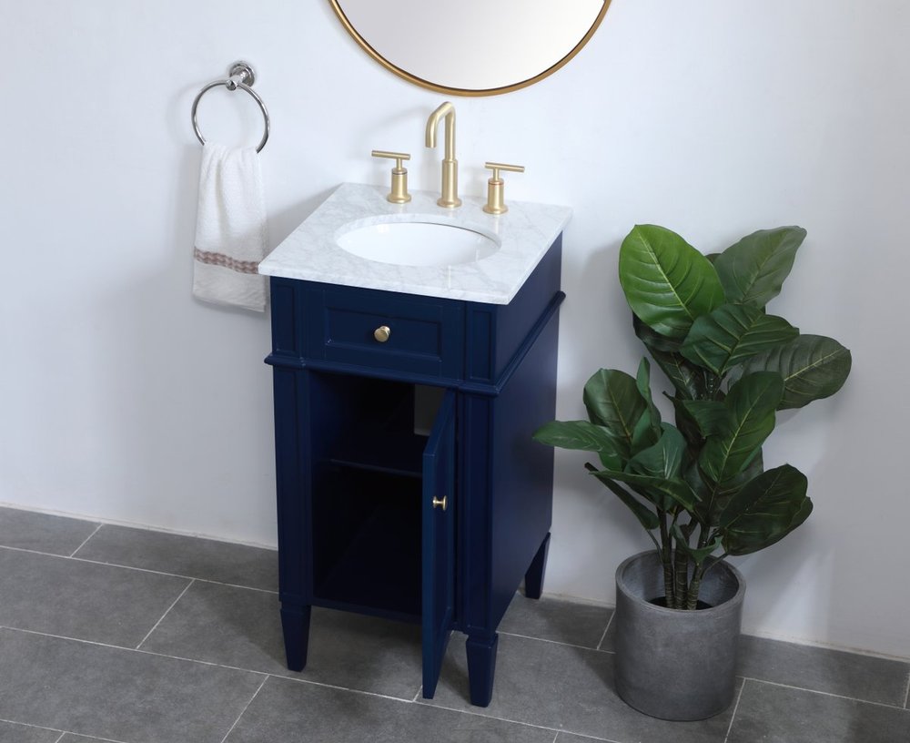 Modern sophistication is defined within the urbane blue finish and brushed gold knobs of this compact vanity. Its modest length makes it the perfect addition to any sized home, and saves space with its storage area hidden behind the Single cabinet door. Topped with a Carrara white marble counter top and a porcelain sink, this design will add everlasting class to your bathroom and powder room.