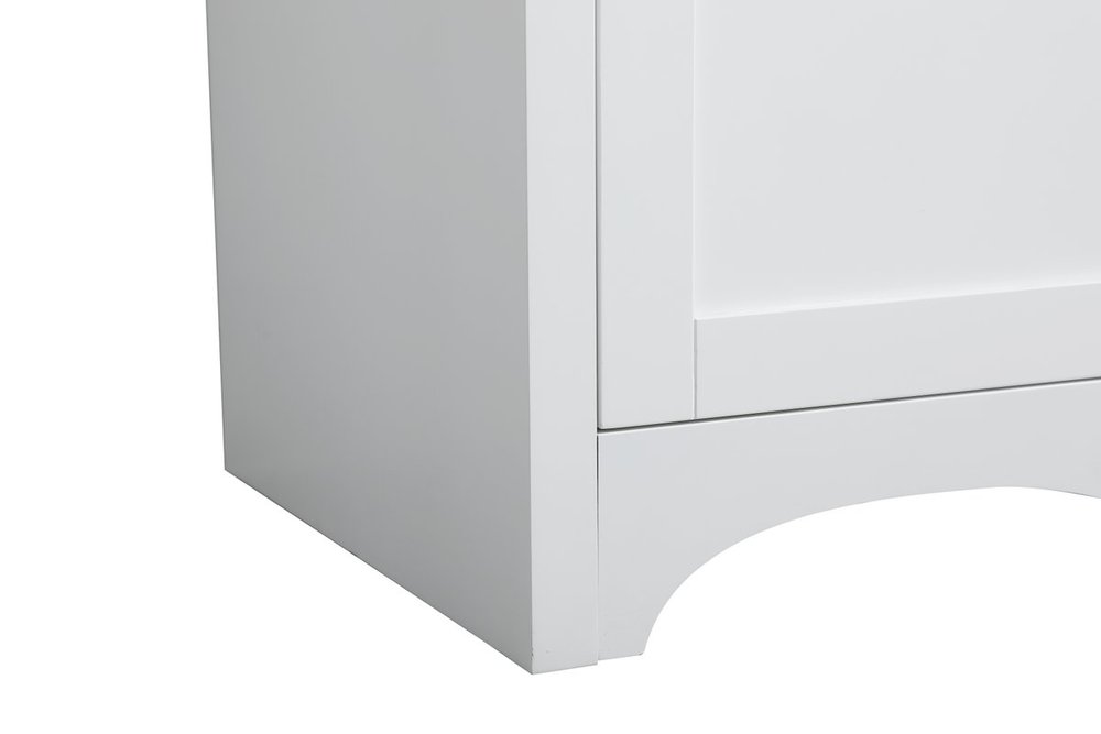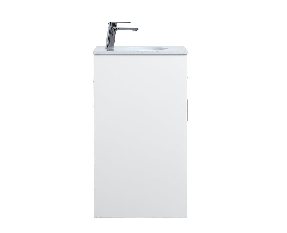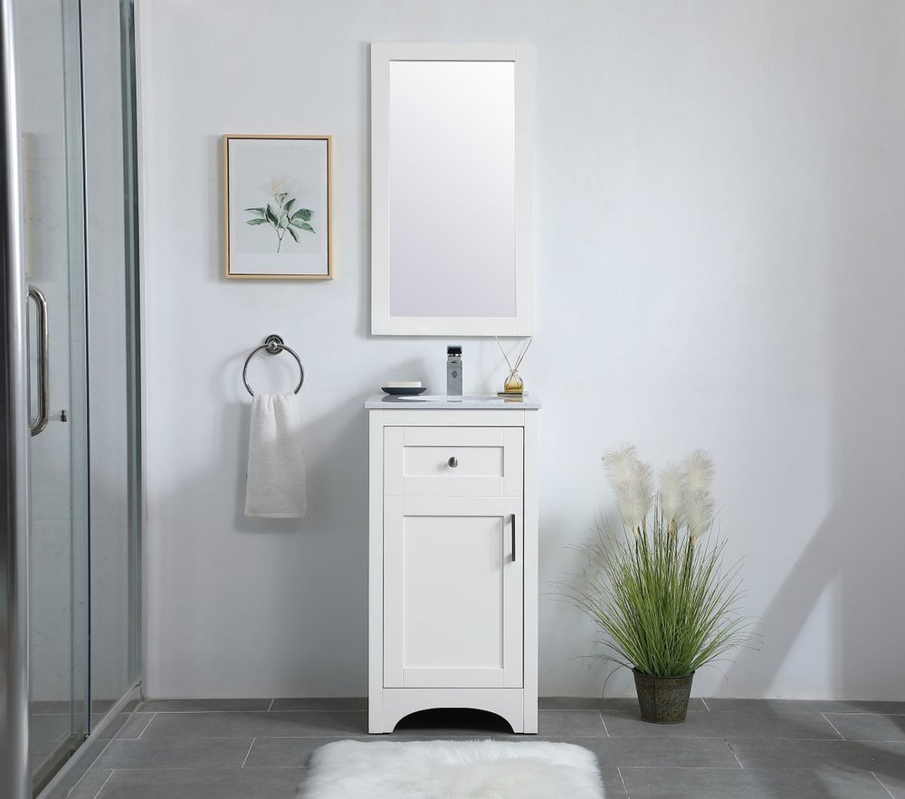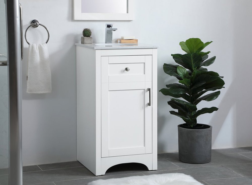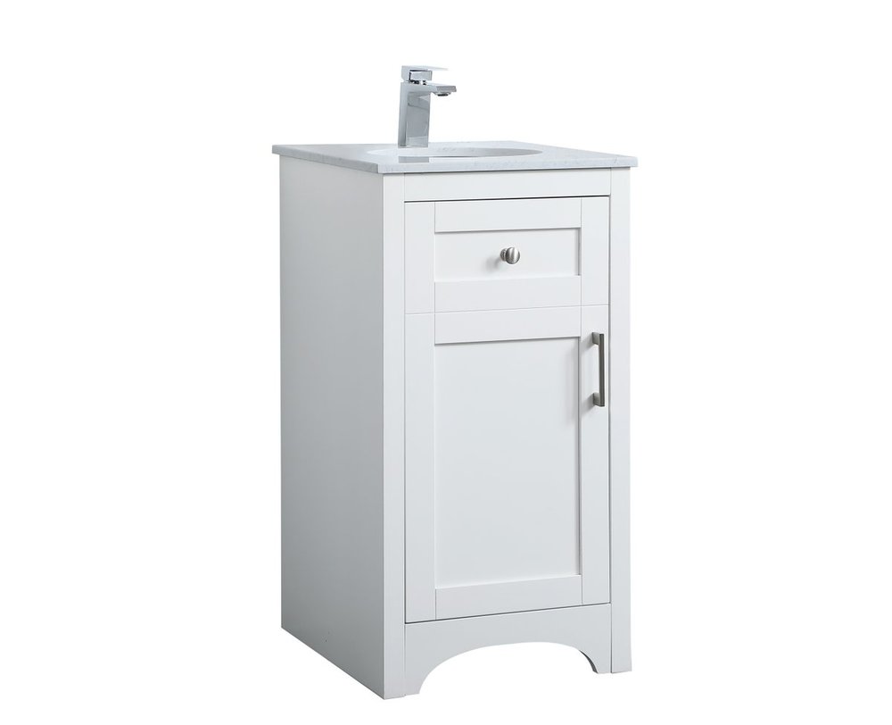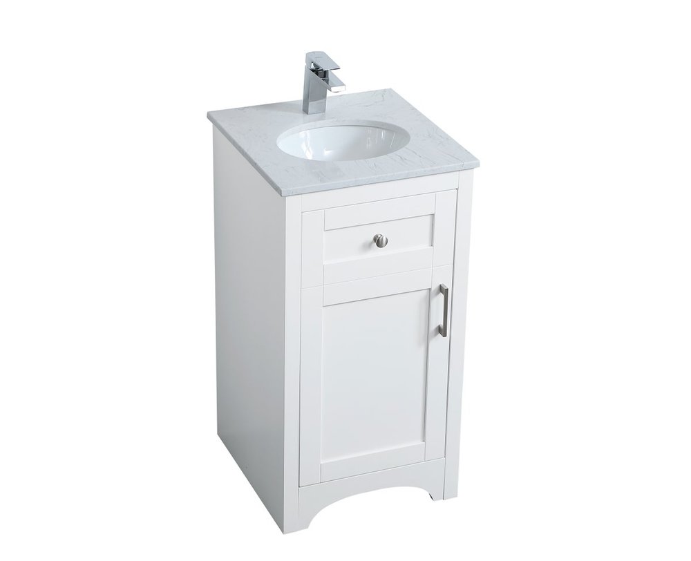 The refined simplicity of this 18" white finish vanity creates a peaceful, yet stylish, atmosphere. Its traditional modernity adds a mature beauty that will elevate any bathroom or powder room--the Calacatta engineered marble counter top adds refined luxe while the brushed nickel handle bars open the Single cabinet door, revealing ample storage space to store and hide away an assortment of bathroom essentials. Whether your home is large or small, this vanity will surely fit in well.