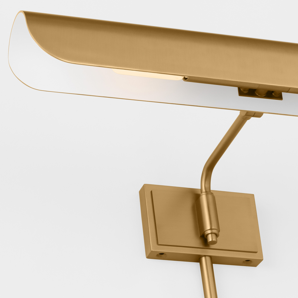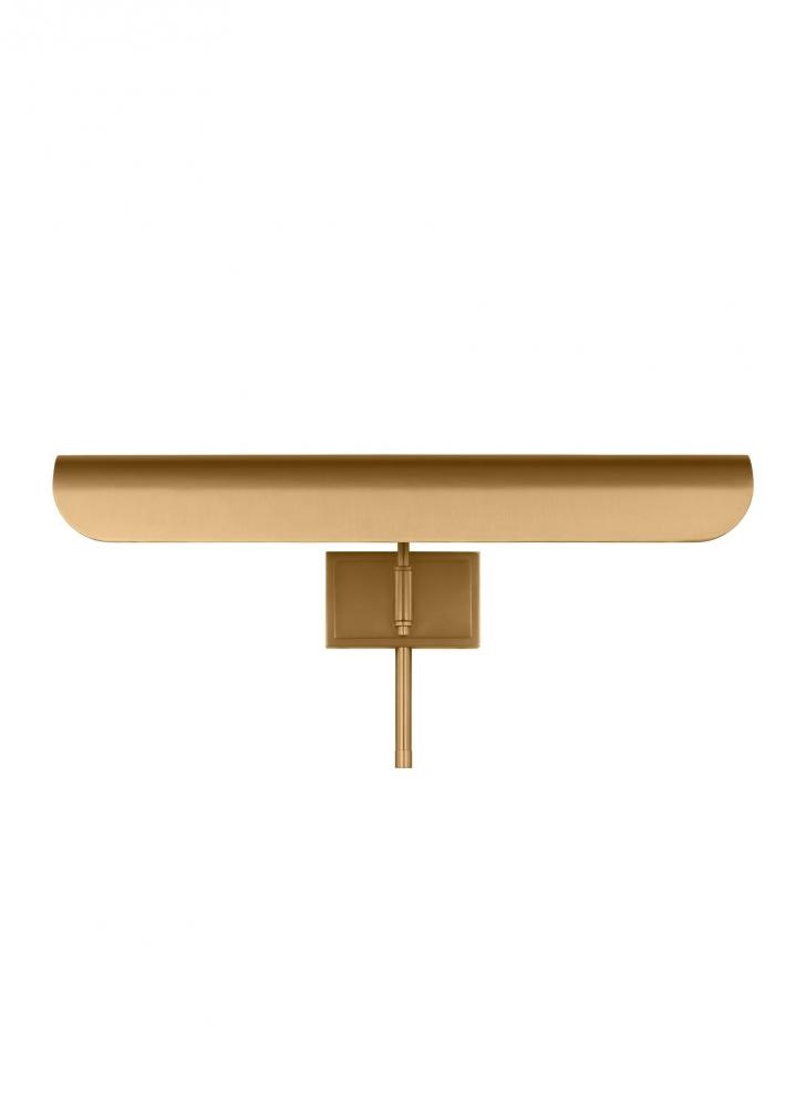 Inspired by a ship's outer hull, the Hull series by Chapman & Myers has a unique shade of these picture lights made from a single piece of metal bent into a cylindrical form. These picture lights have an open-ended design directing light both down and to the sides. A subtle horse saddle design and double barrel back-plate detail that pivots in the direction needed. Available in three sizes and two finish options.