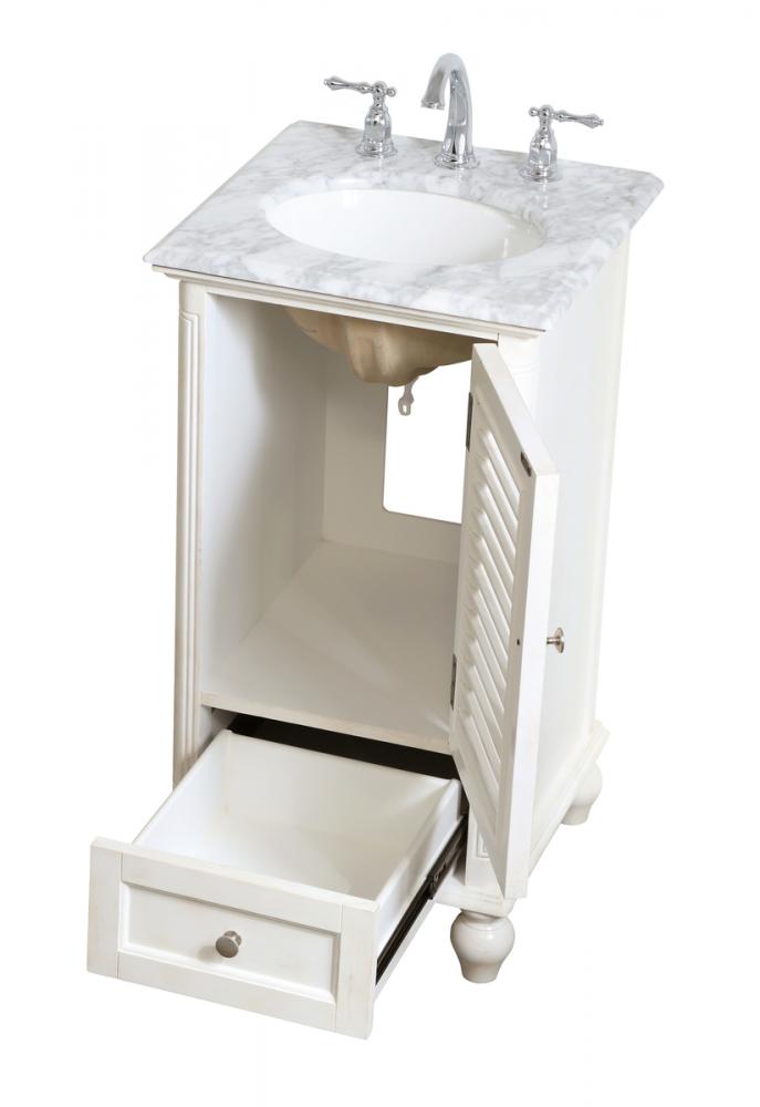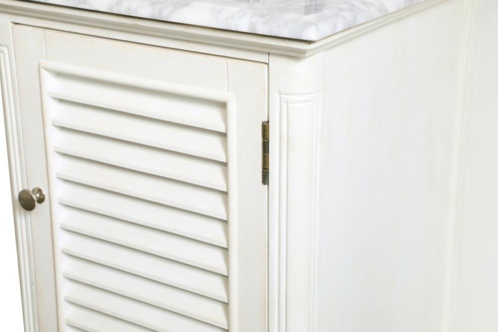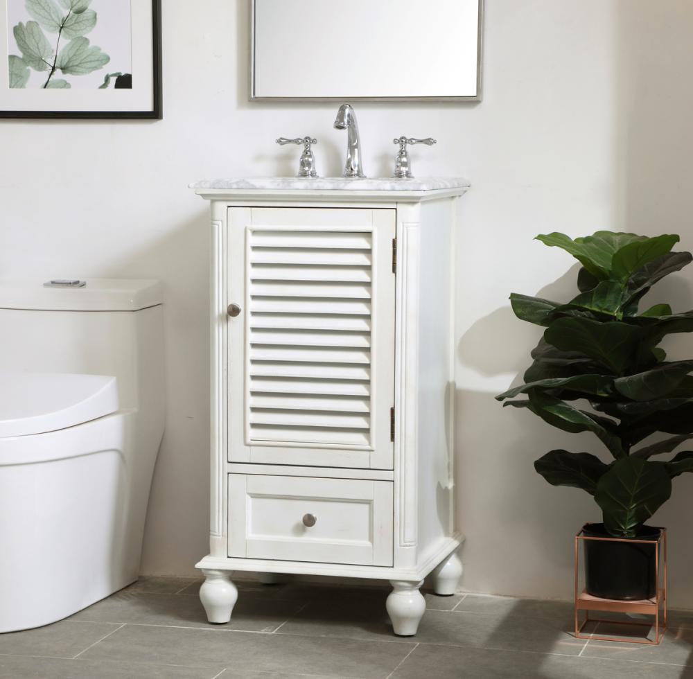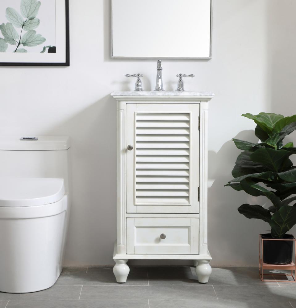 A small space doesn't mean you have to settle for less. The Rhodes collection compact vanity in an antique white finish will add lovely sophistication and complement any small bathroom or powder room, while utilizing its charm and function to provide you with ample storage spaces. Brushed nickel knobs gently adorn the shuttered cabinet door and drawer at the base, allowing for you to store away your bathroom essentials. The Carrara white marble countertop, porcelain undermount sink, dignified subtle engravings on the side edges, and rounded legs all come together to create contemporary beauty. Work with your space, and design a beautiful room, no matter the size.