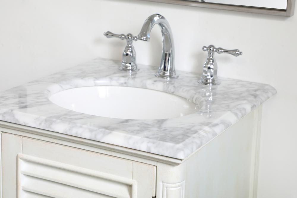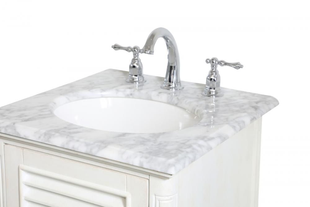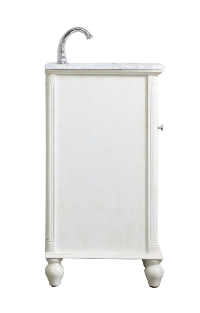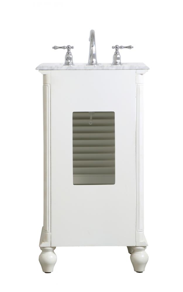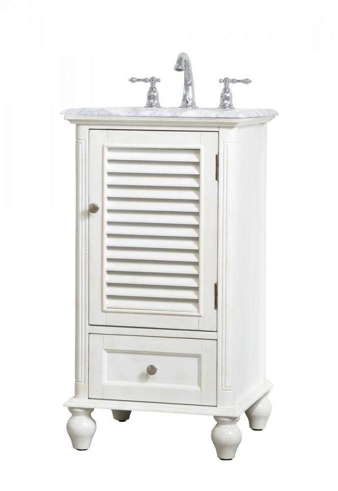 A small space doesn't mean you have to settle for less. The Rhodes collection compact vanity in an antique white finish will add lovely sophistication and complement any small bathroom or powder room, while utilizing its charm and function to provide you with ample storage spaces. Brushed nickel knobs gently adorn the shuttered cabinet door and drawer at the base, allowing for you to store away your bathroom essentials. The Carrara white marble countertop, porcelain undermount sink, dignified subtle engravings on the side edges, and rounded legs all come together to create contemporary beauty. Work with your space, and design a beautiful room, no matter the size.