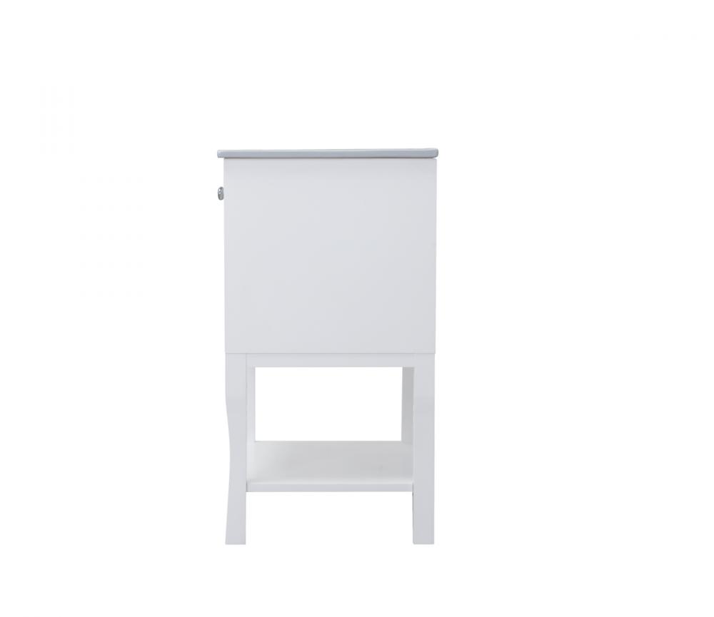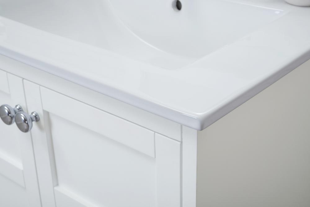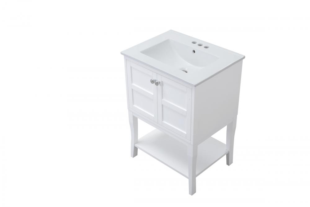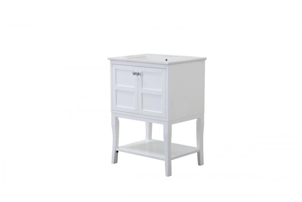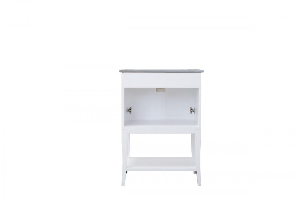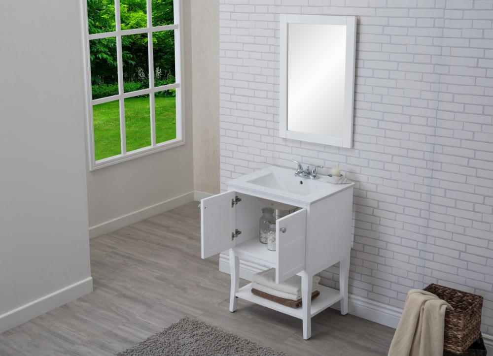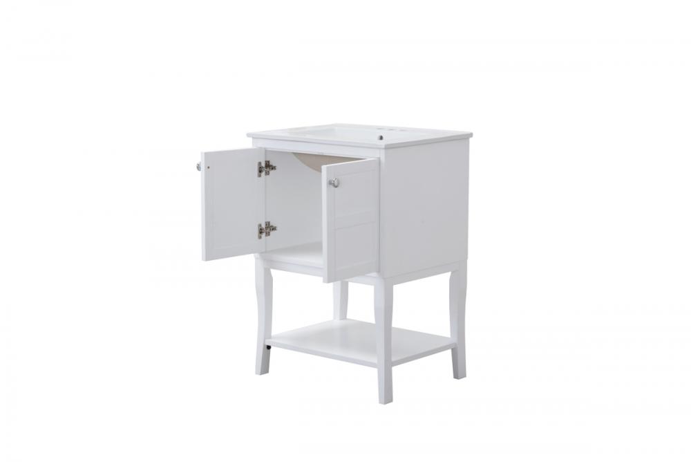 Designed with simple beauty and clean lines in mind , the Mason vanity will surely bring a unique flair to the modern day guest or office bathroom. Its transitional design features 2 framed doors with soft close function and an open shelf for your additional bathroom essential, topped with a modern white resin counter top with an integrated sink, which ensure non stain, scratch resistance and maintenance free use. the cabinet is painted in modern white, accented with round stainless steel door knobs, and build by solid wood frame, with graciously curved legs. FEATURES: *Mason collection *resin top with integrated sink *Measurements: W24xD18xH34” *Cabinet finish: white *4” spread ready to install faucet hole *2 doors and 1 shelf *Door knob finish: chrome *Build with solid wood and engineered wood. PRODUCTS DETAIL: *Top material: resin *Sink: resin *Base material:wood *Faucet: not included *Door included: 2 *Shelf: 1 *installation: required.