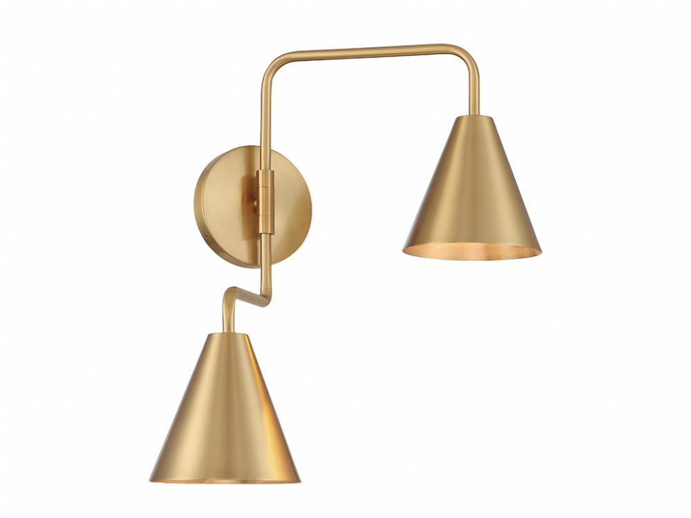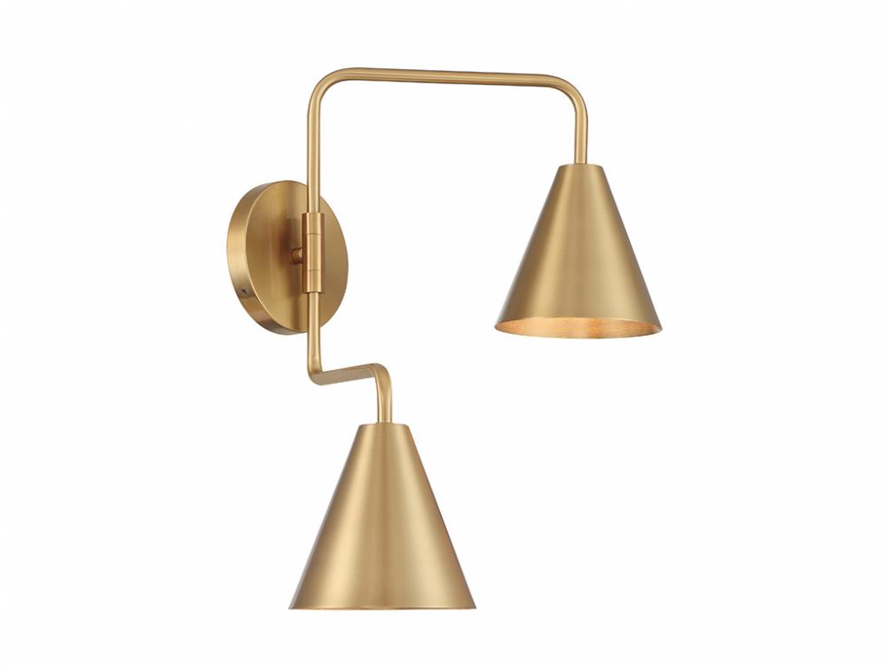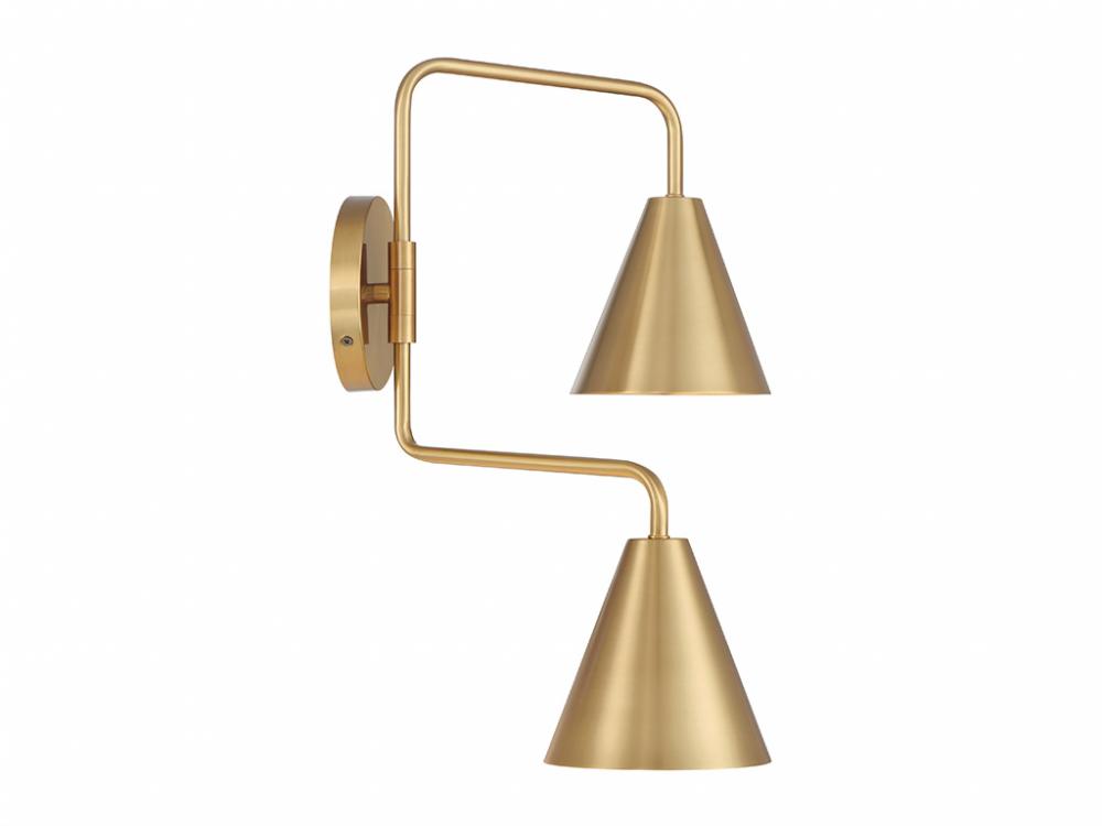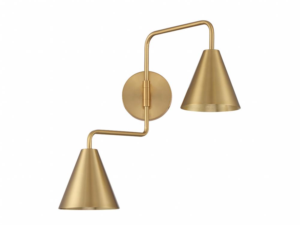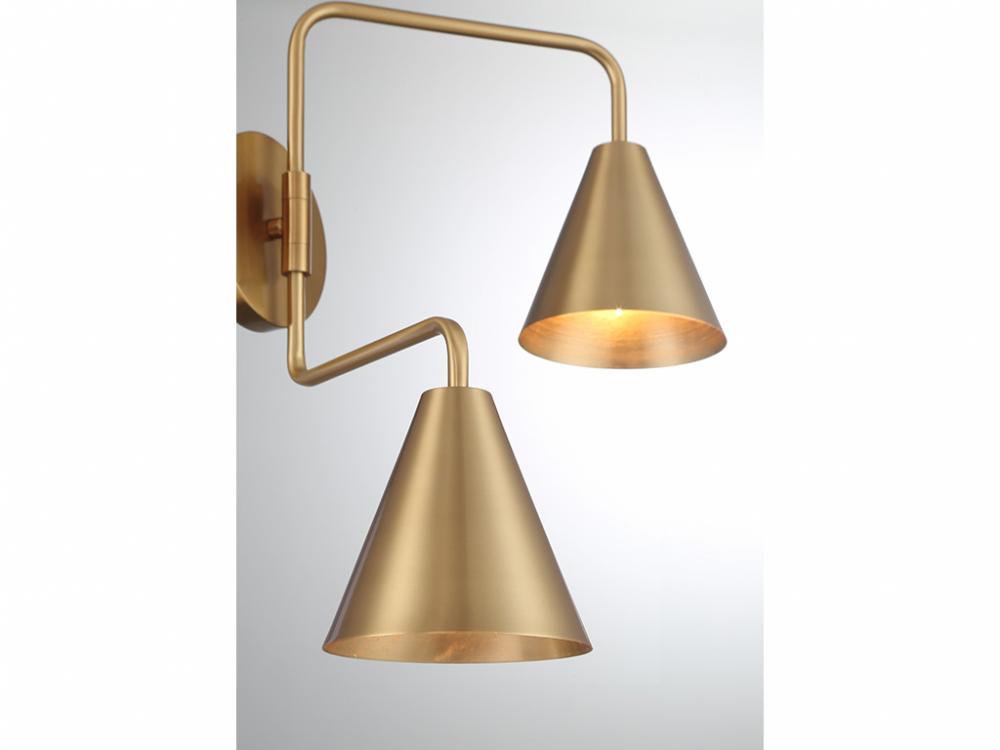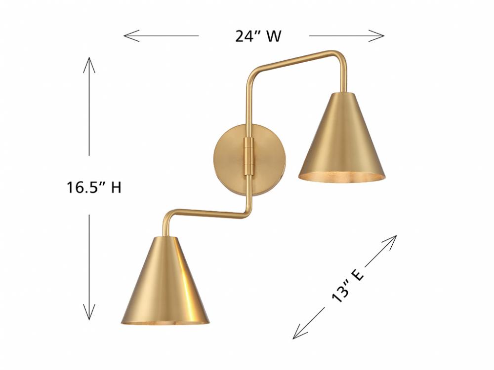 The boldly angled arms and shining Natural Brass finish of this 2-light adjustable wall sconce combine to make it a true conversation piece. Customize it by adjusting the arms as needed! The shades are opaque, so they will concentrate and direct the light. The sconce is 16.5" in height, 24" in width and extends 13" from the wall. It uses 2 candelabra size bulbs of up to 60 watts per bulb. Bulbs not included.