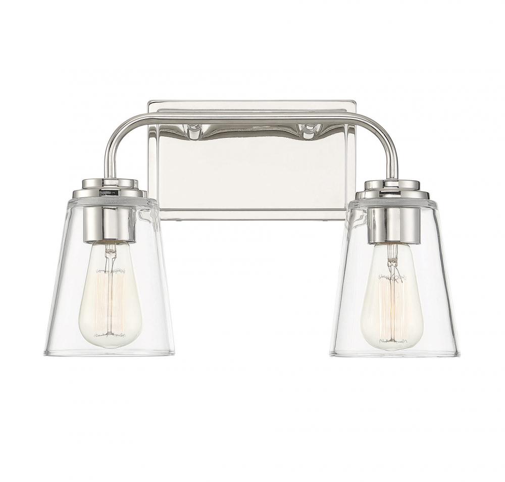 Featuring a simple, sleek design and conical shades of clear glass, this 2-light bath vanity light is a terrific way to improve the illumination and the look of any bathroom. Finished in polished nickel. Can be mounted with its shades facing up or down. 9.75" in height and 15" in width. Extends 6.5" from the wall. It uses 2 standard size bulbs of up to 60 watts per bulb, is LED compatible and is dimmable.
