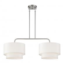 The Manorwood collection has a clean, crisp look and modern appeal. The hand-crafted off white colored fabric hardback double drum shades offer a diffused warm light complementing the bronze finish on this sleek two light linear chandelier. Will adapt well in the living room, dining room and over the kitchen island tastefully elevating your style.