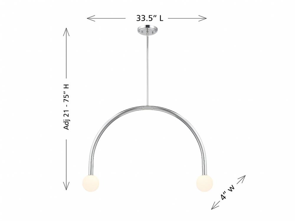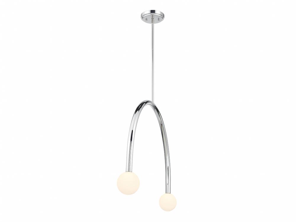 This perky, peppy 2-light chandelier has a curving style that makes a big impact! The light shines from inside orbs of white opal glass and the Chrome finish works beautifully with any decor. This chandelier is 33.5" in length, 4" in width and has an adjustable height ranging from 21" to 75". It comes with four 12" downrods and one 6" downrod. Uses two G9 LED bulbs of up to 3.5 watts per bulb. Bulbs not included.