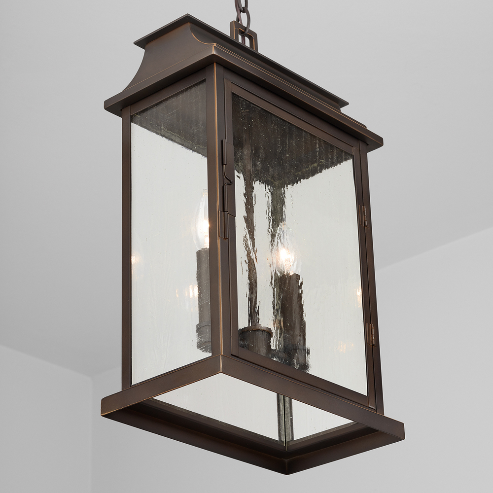 Our Bolton 2-light hanging lantern brightens your porch or covered deck with two candle-style lights encased in textured antique glass. It's a refined addition that adds updated English style to your home in our timeless Old Bronze finish.