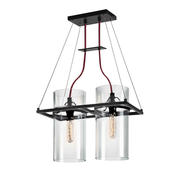 Urban strength combines with delicate elegance: A square frame captures a round ring, glorifying a structural geometry and reconciling cylinders composed in a variety of rectilinear patterns. The industrial edge of the metal structure is in intentional juxtaposition with the pristine quality of the clear glass cylinders.