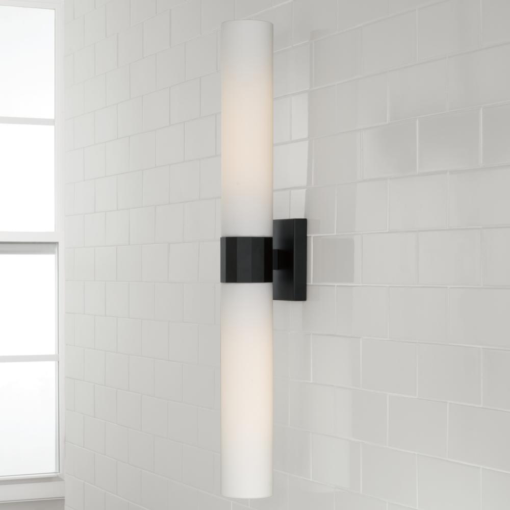 Sophisticated and stunning, the Sutton Dual Sconce puts a tailored touch on a simple form. The contrasting Matte Black faceted band anchors the two Soft White glass shades for elevated elegance.