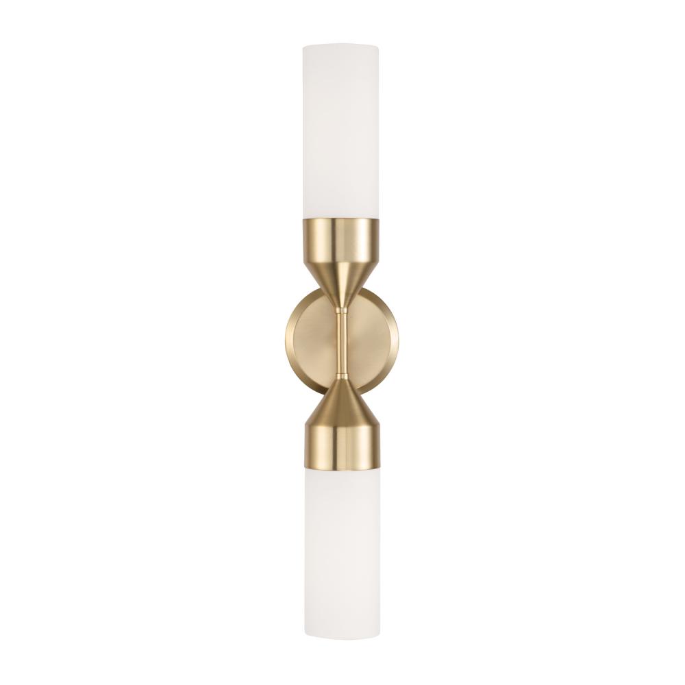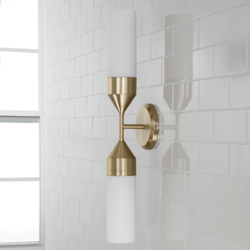 Undeniably sleek, the Devon 2-Light Sconce delivers elegant style. The slim, cylindrical Soft White glass shades create an elongated design, while the Matte Brass finish evokes a mid-century aesthetic.