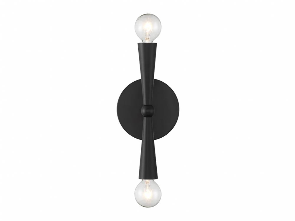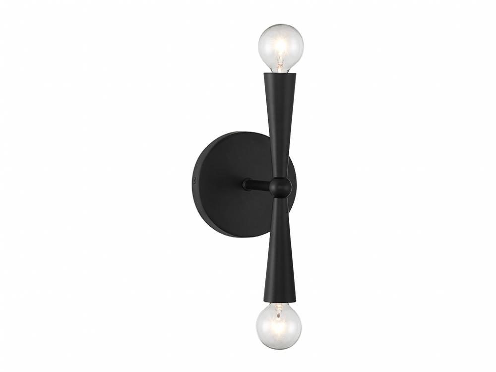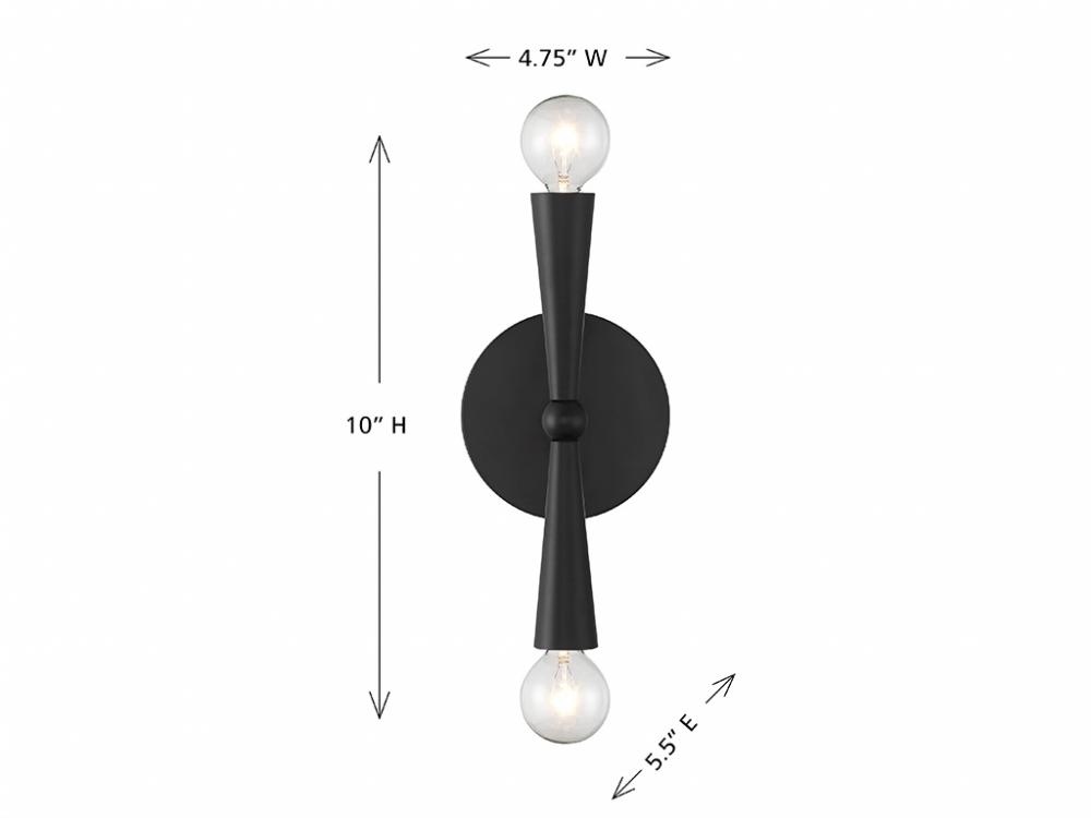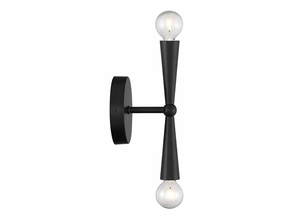 Make a scene with the unique silhouette of this 2-light sconce! Cone-shaped arms finished in Matte Black burst forth from the center, bearing bare bulbs to let the light shine brightly. This sconce is 10" in height, 4.75" in width and extends 4.5" from the wall. Uses 2 candelabra size bulbs of up to 60 watts per bulb. We recommend using globe-shaped bulbs for heightened appeal. Bulbs not included.