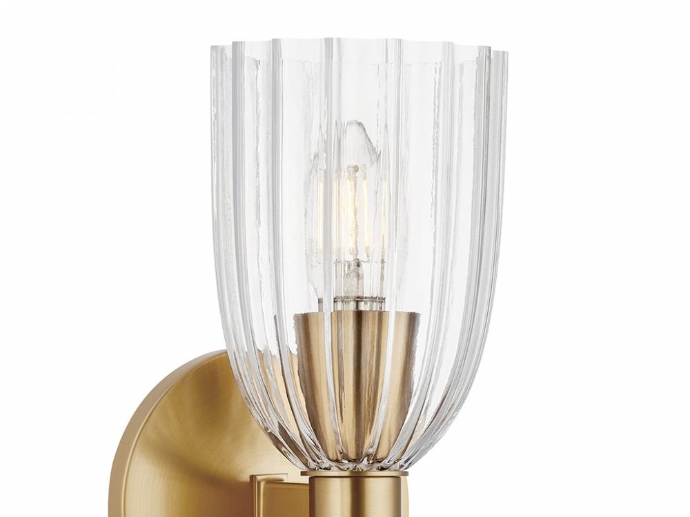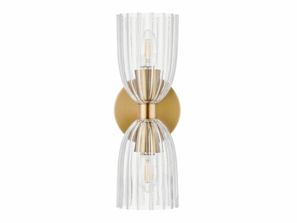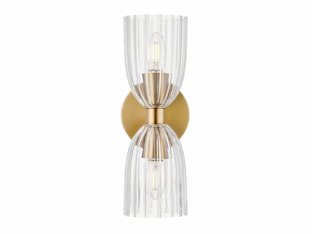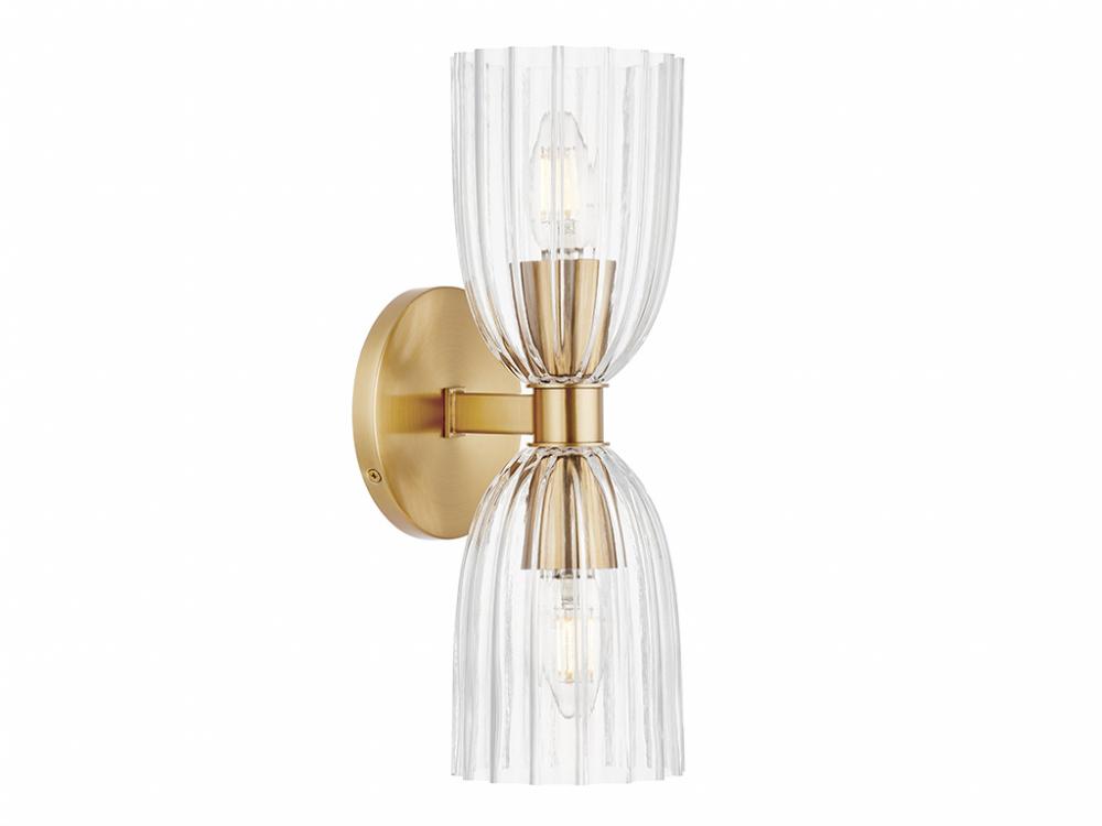 Create beautiful illumination with this 2-light sconce! Its ribbed glass shades bring in a big dose of textural intrigue and its Natural Brass finish adds richness. This sconce is 13.75" in height, 5" in width and extends 5.5" from the wall. It uses two candelabra size bulbs of up to 60 watts per bulb. Bulbs not included.