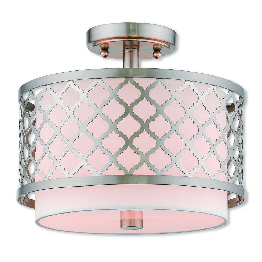 Our Arabesque Two Light Semi Flush Mount Will Add Refined Style And A Hint Of Mystery To Your Decor. The Off-White Fabric Hardback Shade Creates A Warm Illumination, While The Light Brings To Life The Intricate Brushed Nickel Cutout Pattern.